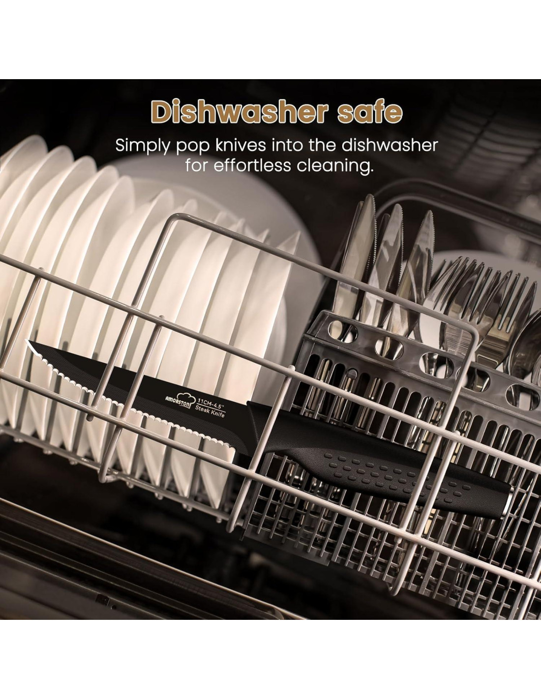 - [Apto para Lavavajillas] Este juego de cuchillos para carne de cocina es fácil de mantener. Apto para lavavajillas. Perfecto para almacenamiento después de lavar y secar. Todo el cuerpo del juego de cuchillos para cocina está hecho de material de acero inoxidable premium. La capa superficial tiene un recubrimiento anti-óxido de alta calidad, que no se oxidará tan fácilmente como otros juegos de cuchillos de cocina, y no causará daños a pesar del alto impacto del lavavajillas.