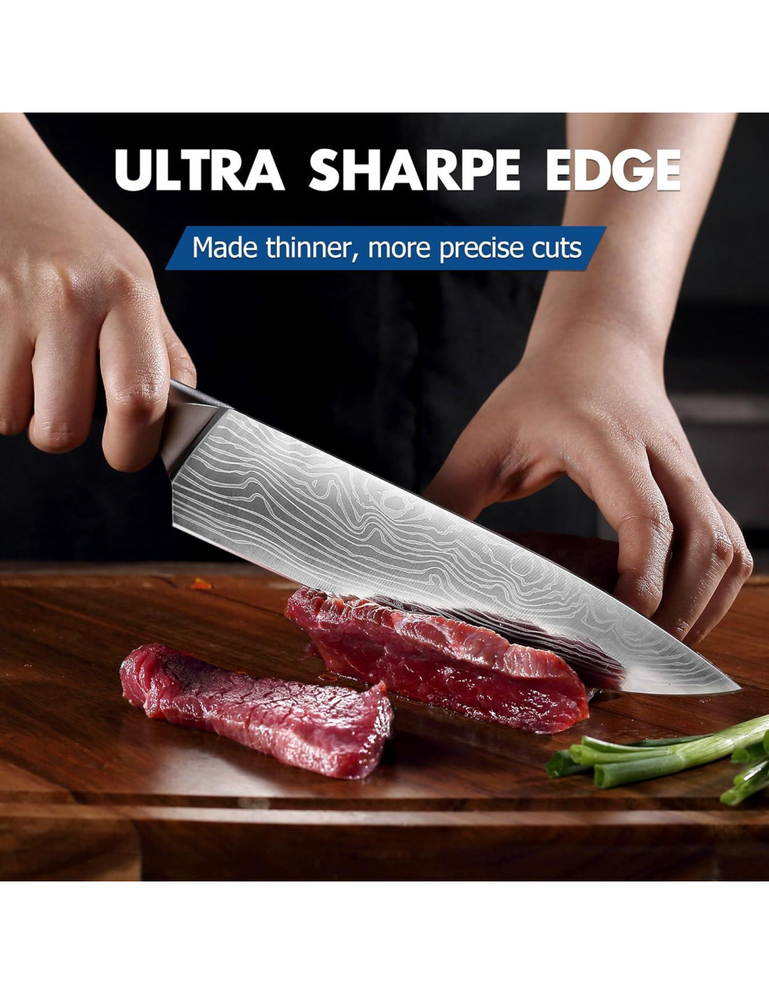 - Juego de Cuchillos Multifuncional: Este juego de cuchillos para cocina maneja fácilmente tus tareas diarias de cocina como picar, rebanar, cortar frutas, verduras y una variedad de carnes incluyendo pescado, pollo y res. El patrón cóncavo diseñado en la hoja no solo mejora la estética, sino que también reduce la resistencia al corte y evita que la carne se adhiera a la hoja. Es verdaderamente un cuchillo de cocina versátil y la primera opción de cocineros caseros y profesionales por igual.