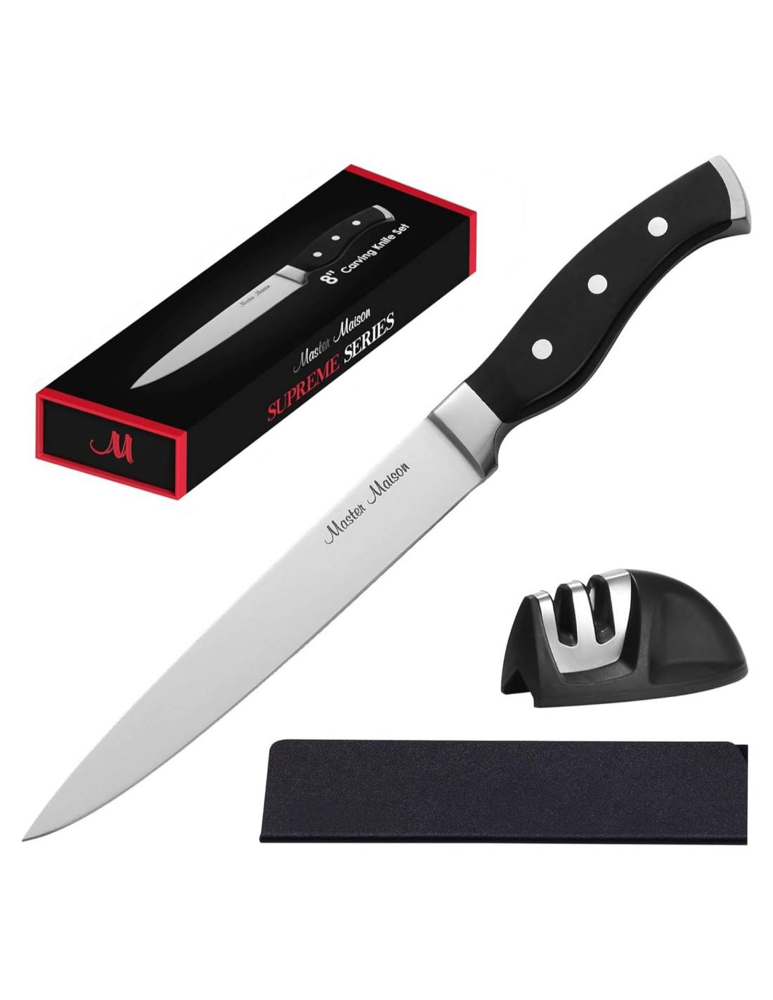 - Juego completo de cuchillos de tallado para cocina: Diseñado para cortar suavemente asados, pechos y pavos, este juego incluye un cuchillo de acero inoxidable de 8 pulgadas; una adición ideal a cualquier juego de cuchillos de tallado de cocina