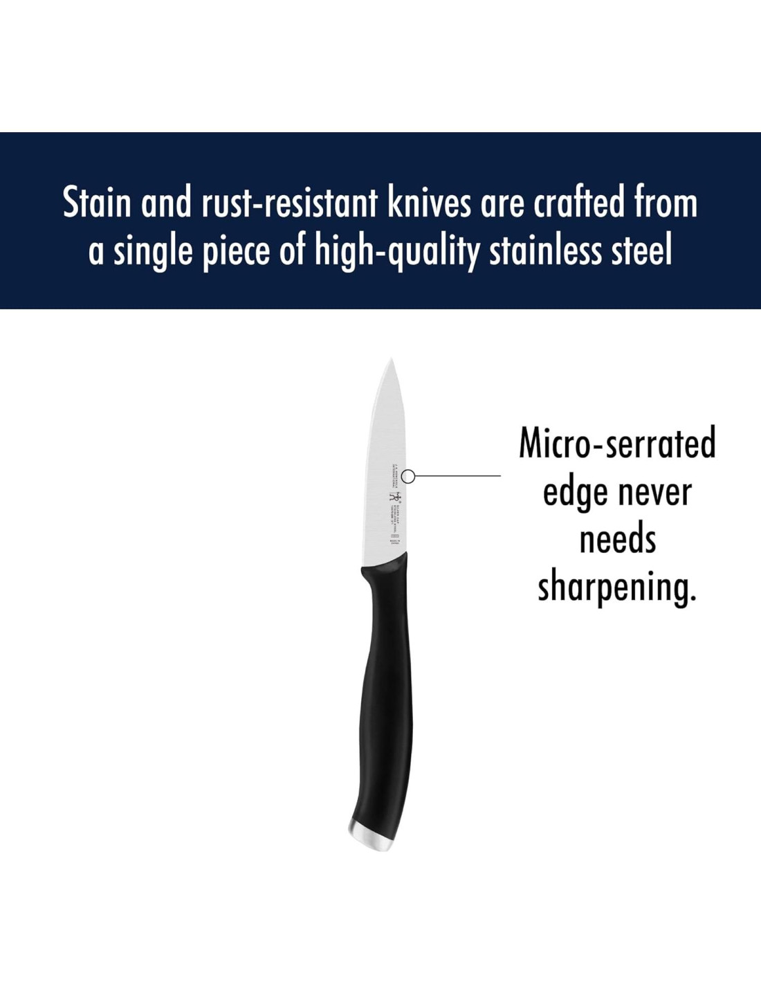 El cuchillo de pelar de 3" Silver cap de Henckels International es perfecto para tareas detalladas en la cocina. Gracias a su práctico borde micro-serrado, la hoja nunca necesita ser afilada. Pela manzanas, quita imperfecciones y crea hermosas guarniciones sin esfuerzo; este pequeño y ligero cuchillo es fácil de maniobrar. Los cuchillos ofrecen una construcción de una sola pieza, estampada con precisión para una durabilidad duradera. Fabricados con acero inoxidable superior, los cuchillos ligeros son fáciles de maniobrar. El mango tradicional, con tres remaches, proporciona equilibrio y comodidad mientras picas. Con sus elegantes tapas de acero inoxidable, querrás presumir de tu Silver cap. Henckels International fabrica herramientas de cocina esenciales que todo chef en casa necesita. Desde cuchillos de carne hasta espátulas, cada producto ofrece alta calidad a un valor excepcional. Creada en 1895 por Zwilling J.A. Henckels, esta marca orientada al valor garantiza la misma durabilidad, diseño y facilidad de uso por la que la empresa global es conocida. Equipa tu cocina con experiencia con Henckels International.