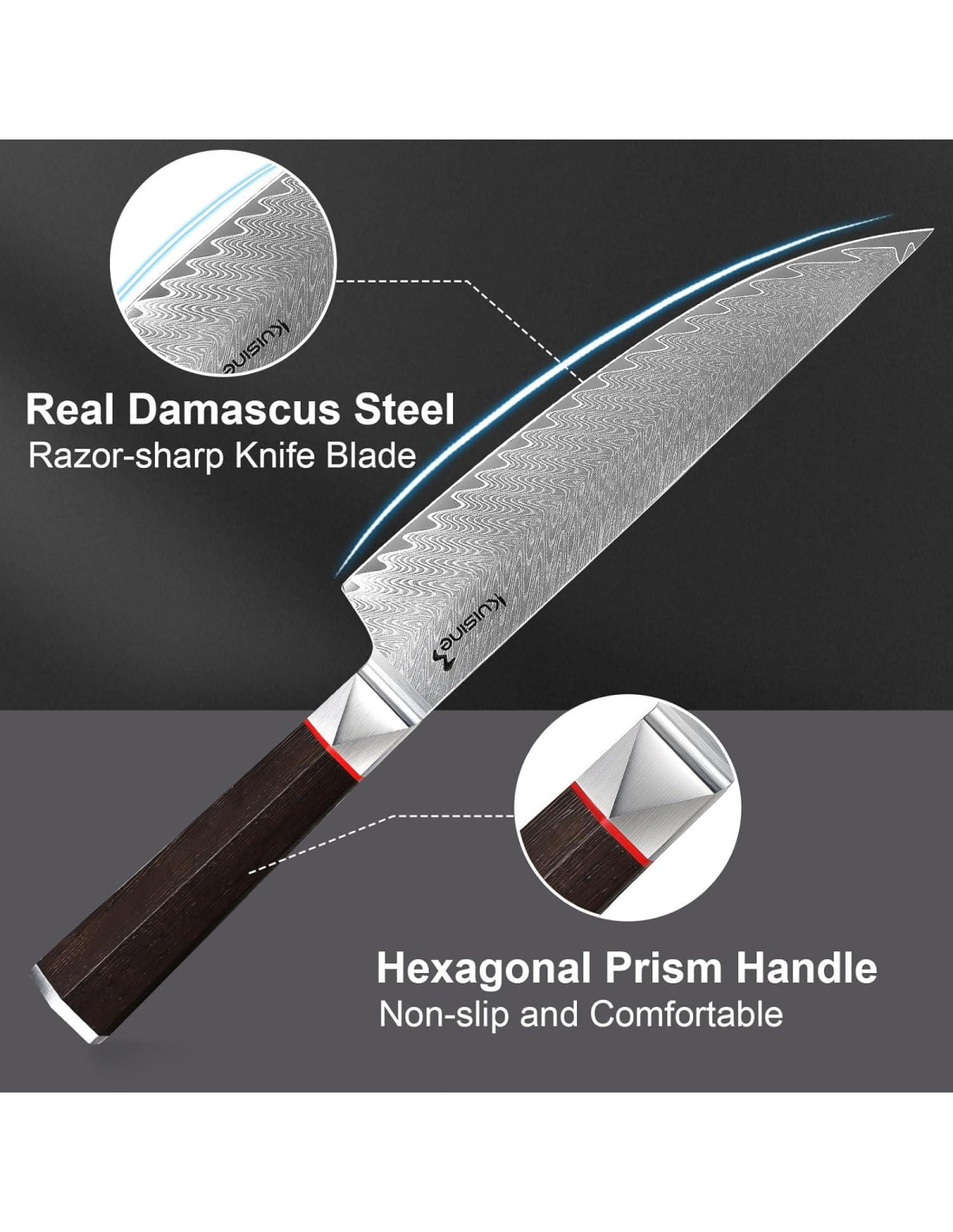 - Juego de cuchillos de bloque de Damasco de alto valor: el juego de cuchillos de chef de Damasco auténtico de Kuisine incluye un cuchillo de chef profesional de 8" (20.32 cm), cuchillo santoku de 7" (17.78 cm), cuchillo de pan serrado de 8" (20.32 cm), cuchillo de utilidad de 5" (12.7 cm), cuchillo de pelar de 3.5" (8.89 cm), 4 cuchillos de carne de 5" (12.7 cm), 1 par de tijeras de cocina y un bloque de madera con afilador incorporado.