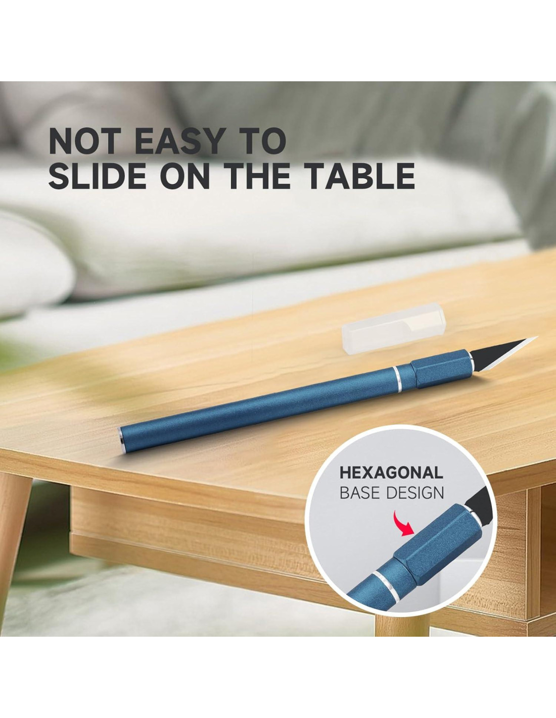 - Diseño de Base Hexagonal y Función Magnética: Cuando colocas el cuchillo de hobby sobre la mesa, el diseño de base hexagonal en un extremo del cuchillo puede evitar que ruede sobre la mesa. El diseño magnético en el otro extremo del cuchillo puede absorber fácilmente la cuchilla de la mesa, facilitando el reemplazo de la cuchilla.