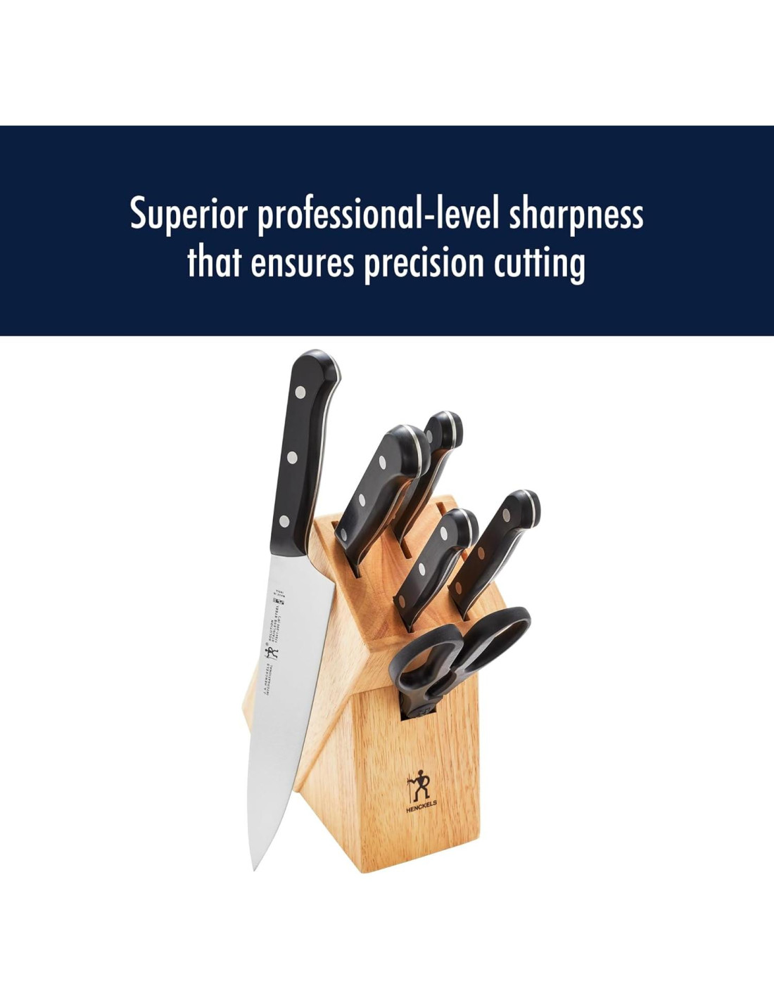 Equipa tu cocina por menos con estos cuchillos esenciales. El juego de bloque de cuchillos de 7 piezas cuenta con todos los cuchillos que necesitas para equipar tu cocina correctamente. Desde el cuchillo de pelar para trabajos a menor escala hasta el cuchillo de chef para rebanar y picar, este conjunto contiene los cuchillos clave para todos los trabajos de cocina, junto con un resistente juego de tijeras de cocina. El conjunto viene alojado en un elegante y compacto bloque de cuchillos de madera. Afilados para una durabilidad prolongada, estas hojas de filo fino hacen que la preparación en la cocina sea rápida. Desde 1895, Henckels ha estado fabricando cuchillos de alta calidad a un valor excepcional. Los cuchillos Solution están diseñados para abordar cada tarea de cocina. Fabricados con acero inoxidable de alta calidad, las hojas de cuchillo de una sola pieza y estampadas con precisión son ligeras sin sacrificar la resistencia y durabilidad. Curvadas para mayor comodidad, los mangos a prueba de roturas y de triple remache son agradables al tacto, dándote el control que necesitas para cortar a través de cortes más difíciles con facilidad. Este mango ergonómico te permite disfrutar de la máxima maniobrabilidad y un corte sin fatiga. El conjunto incluye cuchillo de pelar de 4 pulgadas (10.16 cm), cuchillo utilitario serrado de 5 pulgadas (12.7 cm), cuchillo utilitario de 6 pulgadas (15.24 cm), cuchillo de pan de 8 pulgadas (20.32 cm), cuchillo de chef de 8 pulgadas (20.32 cm), tijeras de cocina y bloque de madera de 6 ranuras.
