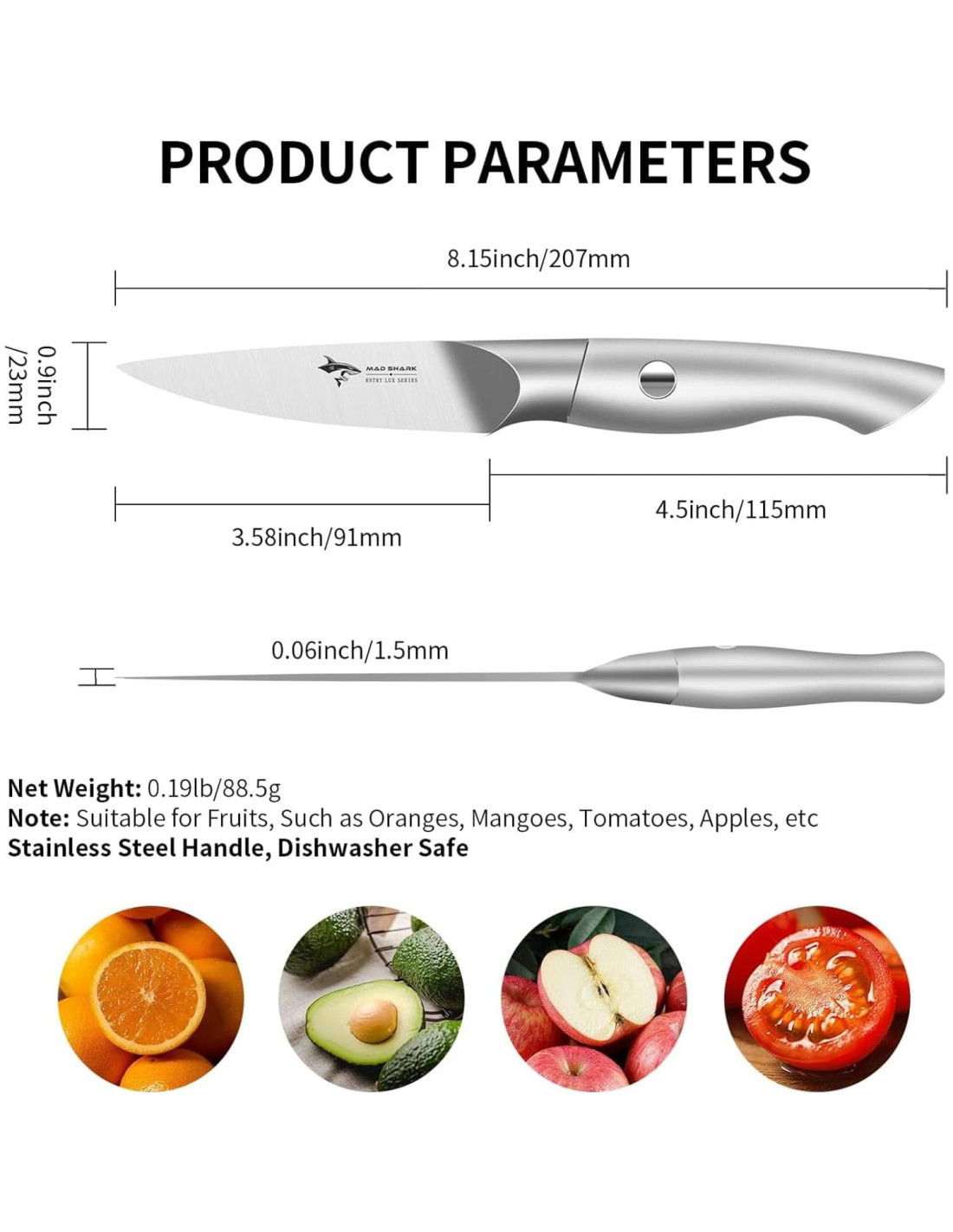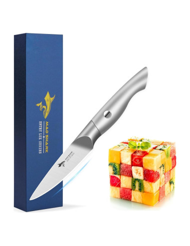 - Uso Versátil: Ya sea que necesites un cuchillo para frutas, cuchillo para verduras o cuchillo para pan, nuestro cuchillo de pelar MAD SHARK ofrece una versatilidad inigualable. Su tamaño de hoja de 3.5 pulgadas (8.89 cm) permite cortes precisos y un manejo fácil, convirtiéndolo en una herramienta esencial en cualquier cocina.