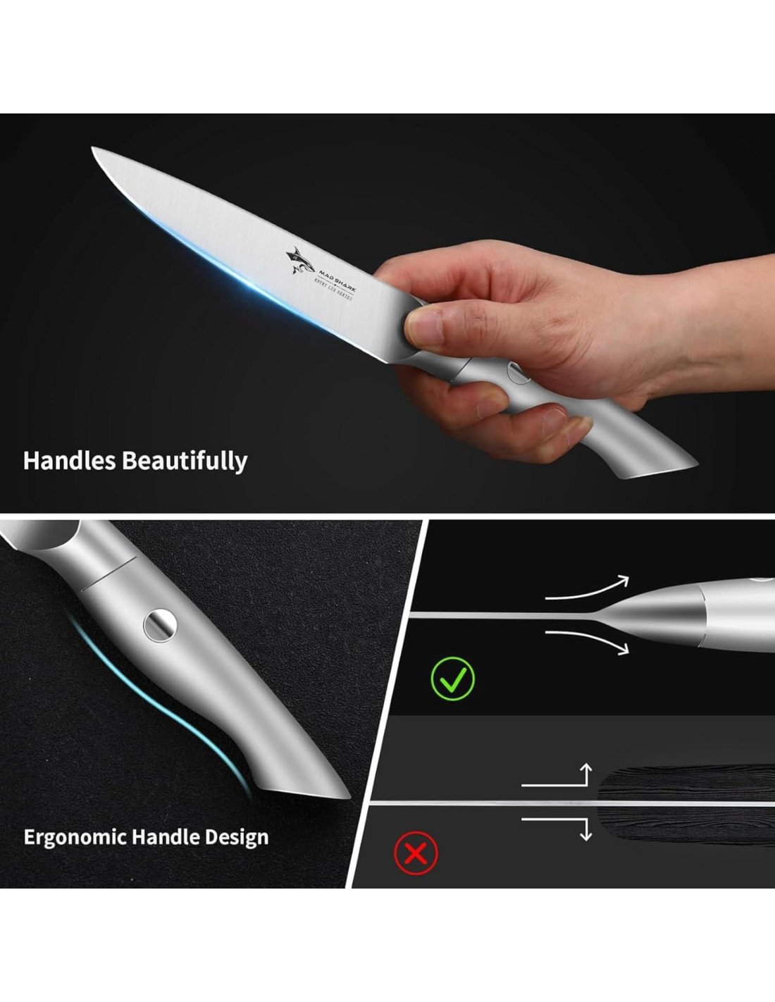 - Cuchillo de Pelar de Alto Rendimiento: El cuchillo de pelar MAD SHARK está elaborado con maestría para un rendimiento excepcional, lo que lo convierte en el cuchillo de cocina pequeño perfecto tanto para chefs profesionales como para cocineros caseros. Esta herramienta de cocina versátil sobresale en cortes de precisión, pelado y rebanado, ideal para todas tus necesidades culinarias.