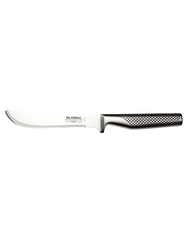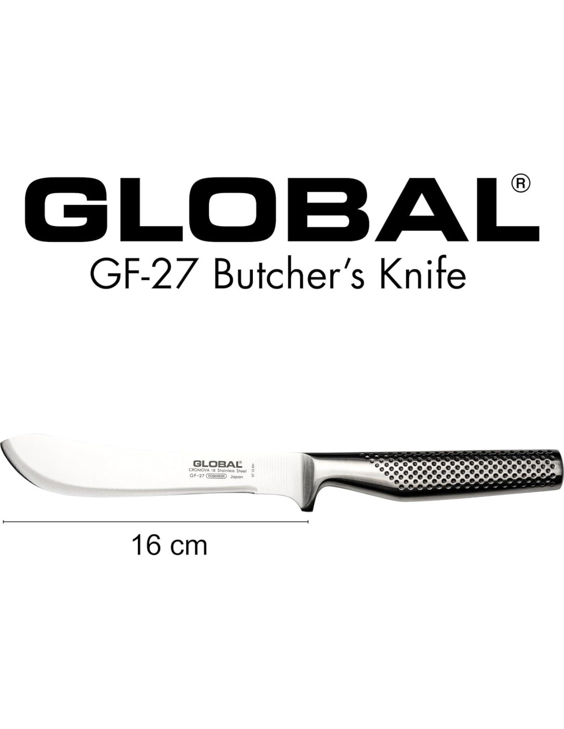 Cuchillo de carnicero pesado de 7 pulgadas Global. Este cuchillo Global de peso pesado tiene más peso y una hoja más gruesa que los cuchillos de nuestra clásica serie G. Excelente para deshuese de carne. Amado por chefs profesionales de todo el mundo, los cuchillos Global son una excelente opción para el cocinero casero serio. La hoja delgada y afilada de Global permite al cocinero cortar limpiamente los alimentos, preservando la integridad del ingrediente y maximizando su sabor. La mayoría de los cuchillos Global están afilados a un punto recto en lugar del estilo occidental de biselar el borde. Para equilibrar sus cuchillos, Global utiliza un mango hueco que está lleno con la cantidad justa de arena para crear el equilibrio correcto. El mango tiene sus propias hendiduras oscuras únicas para un agarre antideslizante. Los cuchillos Global tienen un contorno suave y una construcción sin costuras, completamente de acero inoxidable, que elimina trampas de alimentos y suciedad. Los cuchillos Global están forjados en Japón a partir de acero inoxidable CROMOVA 18, una mezcla de 18 por ciento de cromo para buena resistencia a manchas, además de molibdeno y vanadio que proporcionan una excelente retención del filo.