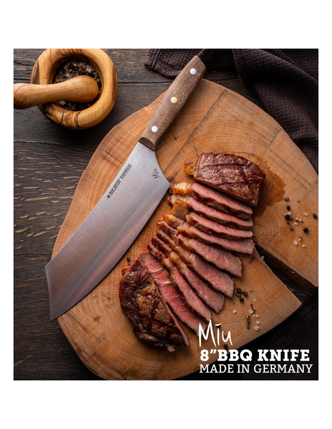 - Para el chef que exige calidad, el borde más afilado del cuchillo BBQ MIU maneja todo, desde carne hasta pescado, transformando tu cocina en un espacio profesional. Un fino mango de nogal realza la apariencia de esta pieza de arte. Con una hoja de 8 pulgadas, es perfecto para cortar, rebanar y deshuesar, ya seas un carnicero o un cocinero aficionado.