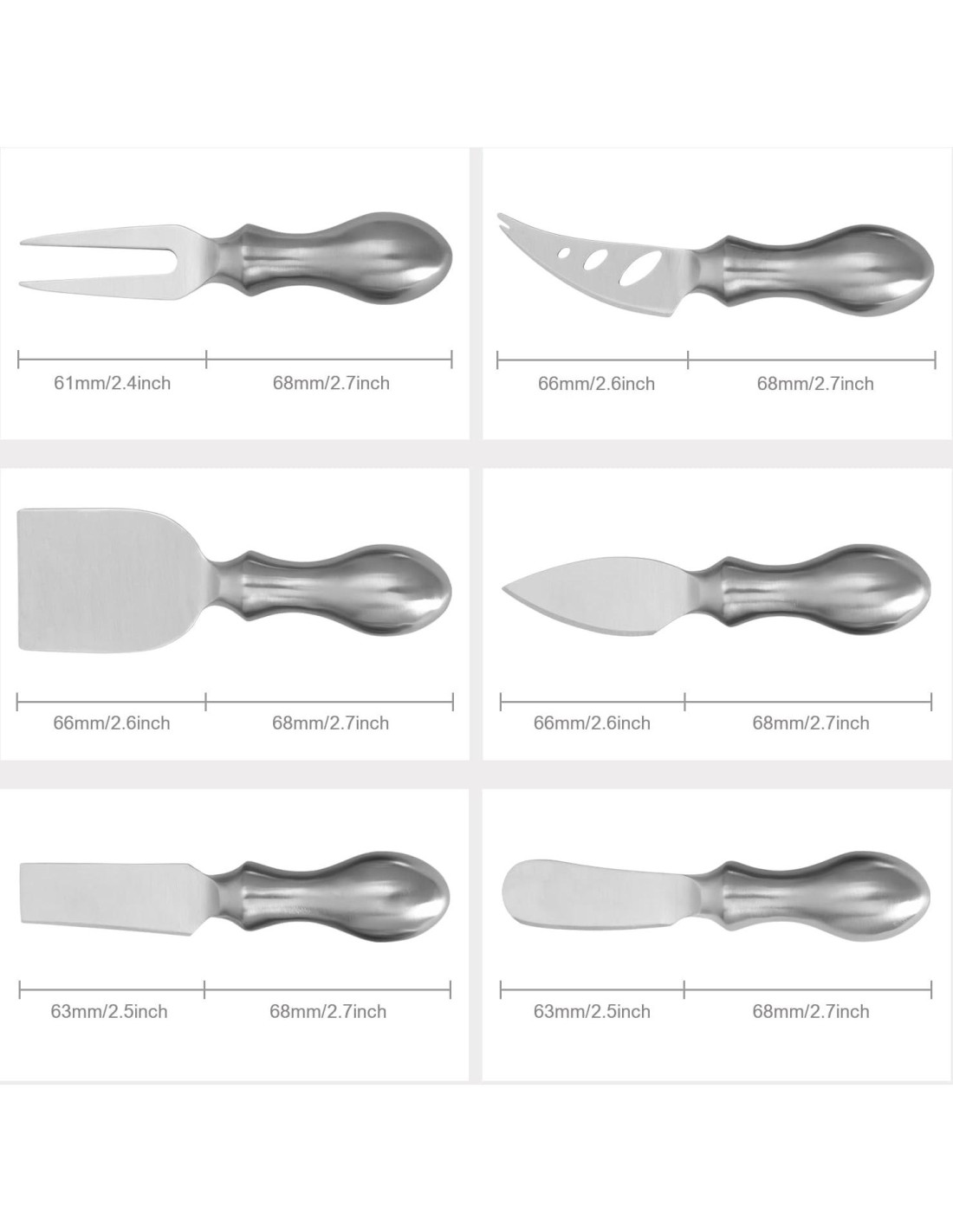 - Juego completo de 6 piezas para cada queso. El juego completo de 6 piezas incluye todo lo que necesitas para una tabla de quesos perfecta. Incluye 6 cuchillos especializados: para queso duro, queso suave, parmesano, queso semiduro, untar y un tenedor de dos púas para servir. Tu kit de accesorios para tabla de quesos todo en uno.