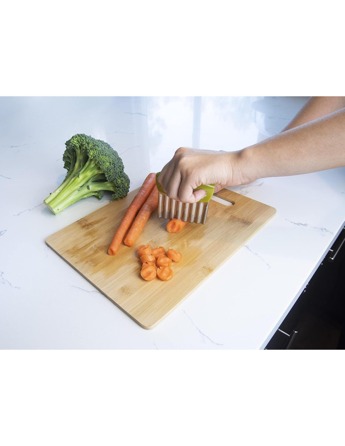 Prueba este colorido cuchillo cortador de ondas con frutas y verduras para bordes elegantes y cortes en forma de waffle. A los niños les encantará ayudar en la cocina con esta divertida herramienta cortadora ondulada.