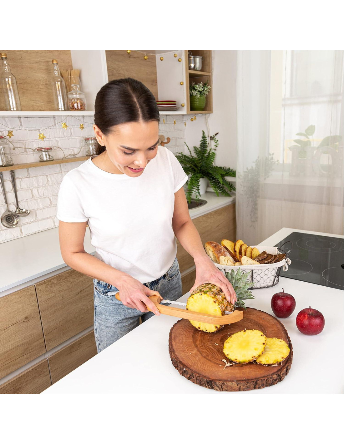 - Versatilidad Infinita: Midiendo 16 1/4 pulgadas (41,28 cm) de largo y 2 3/8 pulgadas (6,03 cm) de ancho con una longitud de corte de 9 pulgadas (22,86 cm), nuestro cortador de pan de madera es perfecto para cualquier hogaza casera. Pero, ¿por qué detenerse ahí? También corta bagels, baguettes, challah, frutas, verduras, queso, pasteles y más.