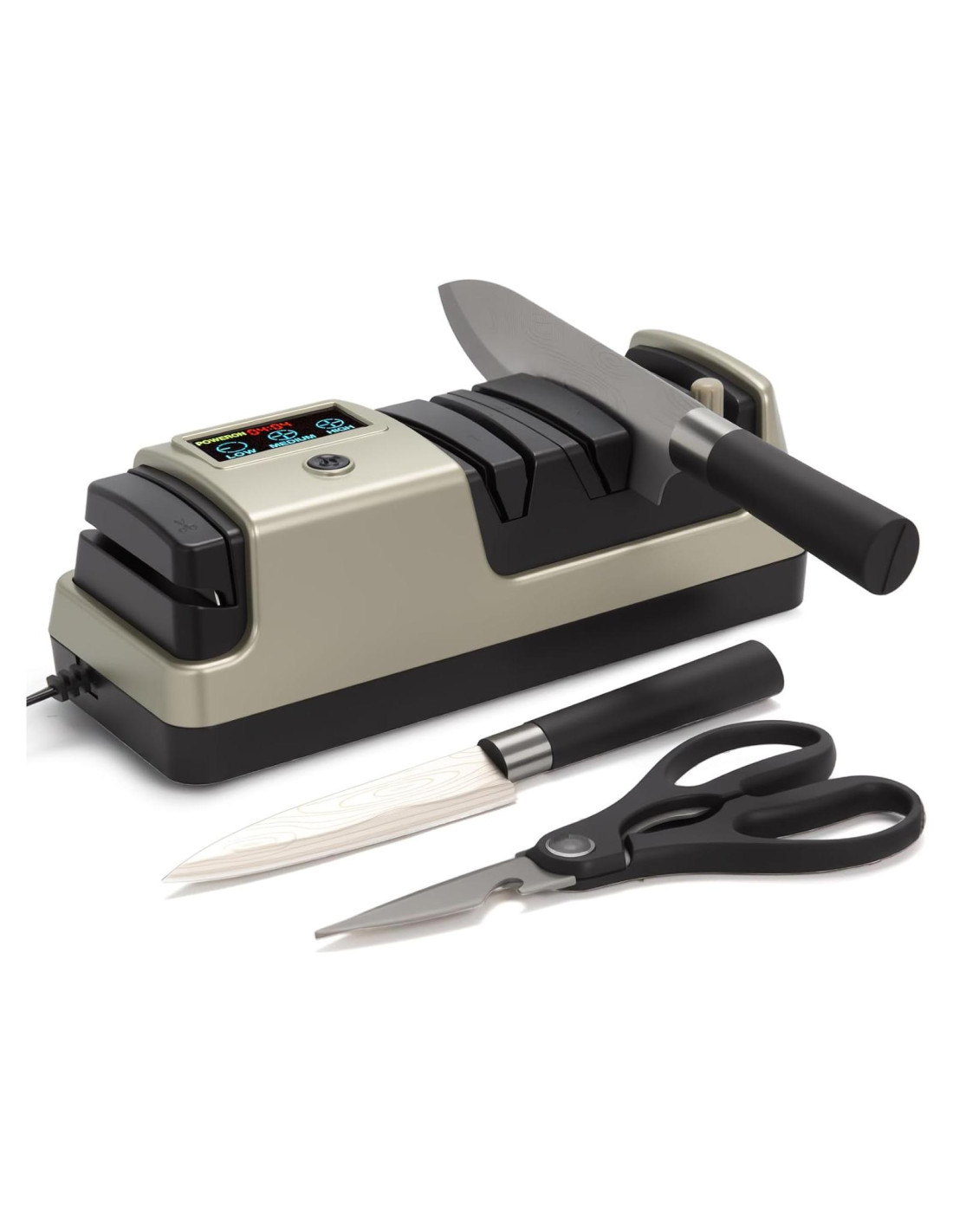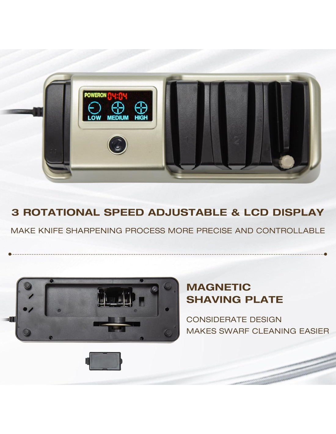 - AFILADOR DE CUCHILLOS ELÉCTRICO DE 3 VELOCIDADES ROTACIONALES: Afiladores de cuchillos eléctricos ajustables de 3 velocidades con pantalla LCD intuitiva y fácil de leer, disponibles en velocidades baja, media y alta