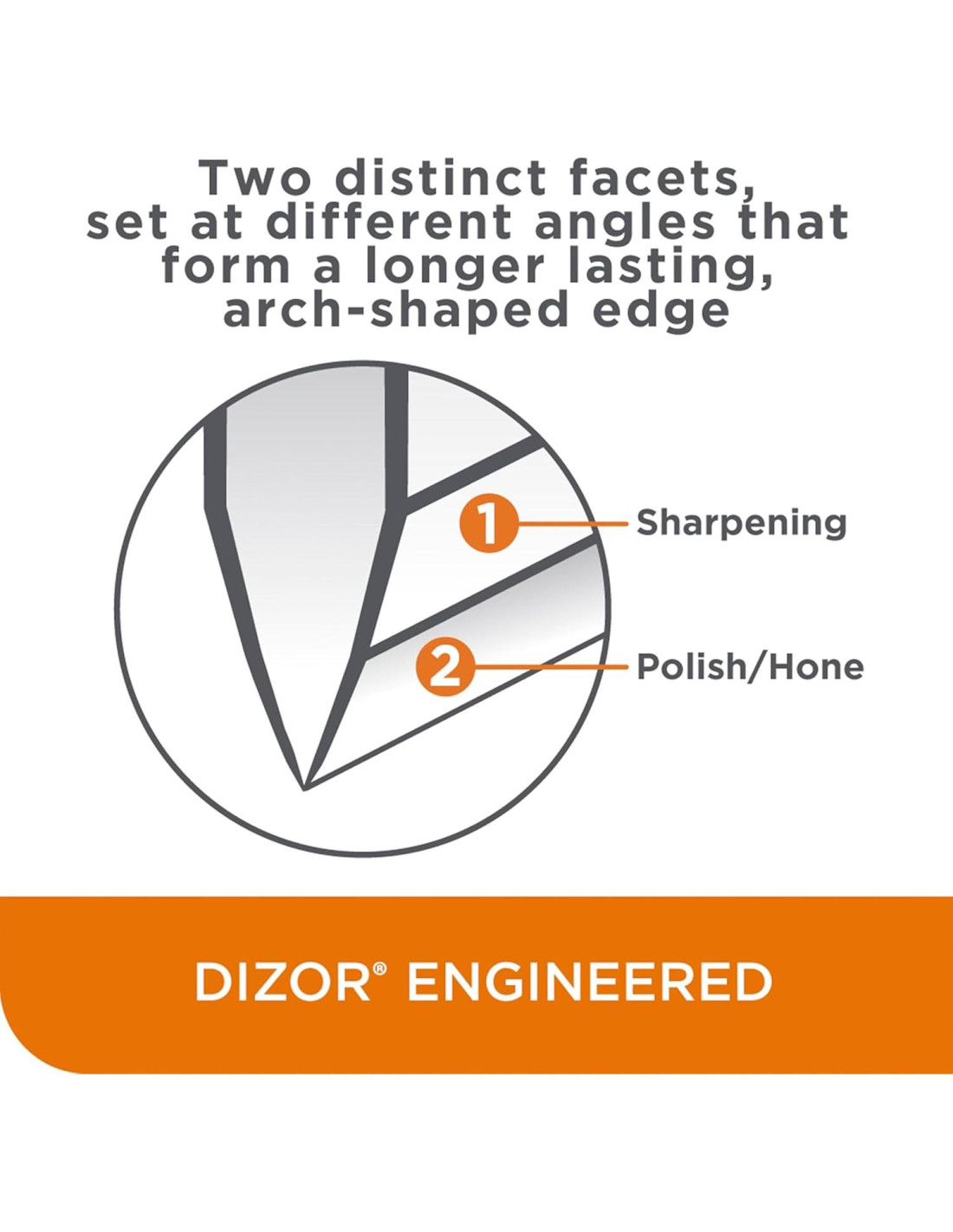 - Pone un borde afilado en cuchillos europeos/americanos (20 grados) y de estilo asiático (15 grados)