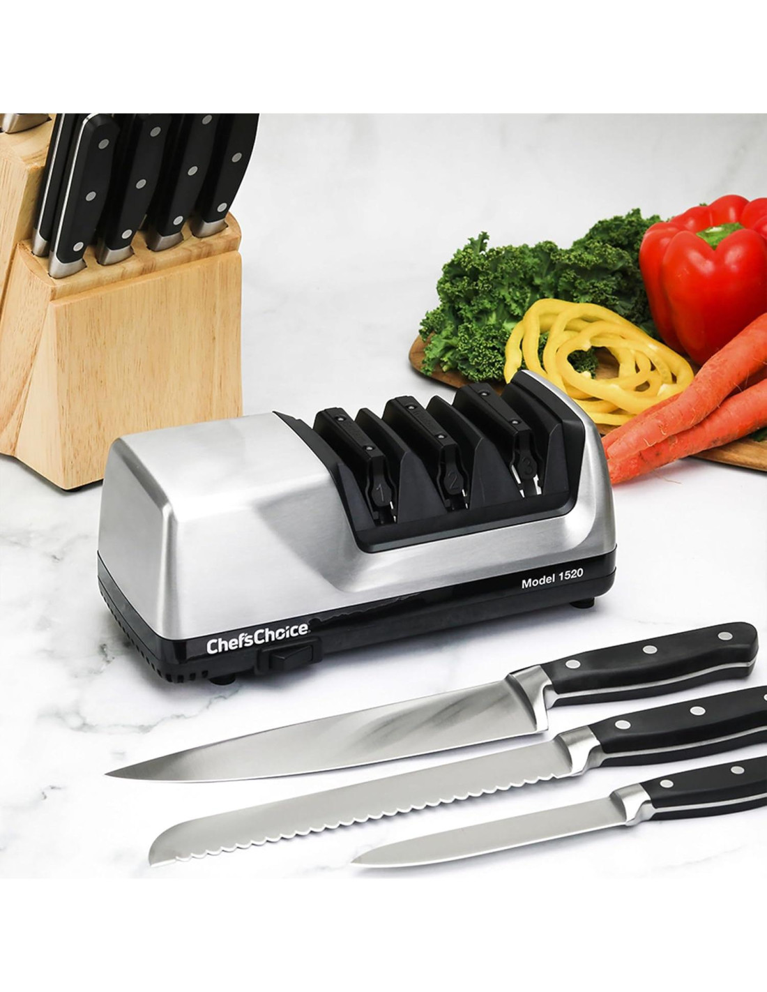 Crea un borde afilado increíblemente como nuevo con este afilador de cuchillos eléctrico de múltiples etapas. Seguro para usar con cuchillos de alta calidad, la unidad puede restaurar un borde de 15 grados para cuchillos de estilo asiático y un borde de 20 grados para cuchillos de estilo europeo y americano. También puede afilar cuchillas de filo fino o serradas, cuchillos deportivos, cuchillos de bolsillo y bordes de un solo bisel de Santoku y de estilo japonés tradicional, incluyendo las cuchillas más gruesas de estilo Deba, así como cuchillas de doble bisel. Su sistema de tres etapas produce un borde perfecto. Las guías de cuchillo precisas posicionan automáticamente el cuchillo para una operación a prueba de errores, mientras que los abrasivos de diamante al 100 por ciento y los discos de pulido y afilado flexibles patentados afilan, perfeccionan y entregan un borde pulido microscópicamente. Otros aspectos destacados incluyen un simple interruptor de encendido/apagado, pies estabilizadores y una construcción duradera.