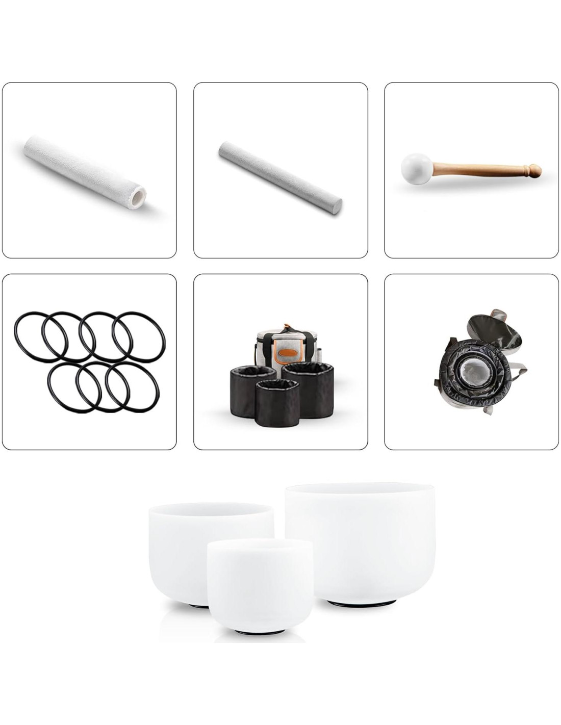 - Conjunto Portátil Completo - Este conjunto de 3 piezas incluye cuencos de canto de cristal de 6" Nota A Tercer Ojo, 8" Nota F Corazón y 10" Nota G Raíz, emparejados con un mazo de goma, un golpeador de gamuza, tres anillos O y un estuche de transporte reforzado. El tamaño escalonado mantiene la portabilidad mientras expande la cobertura vibracional, ideal para altares en casa, terapeutas de sonido o trabajo energético al aire libre.