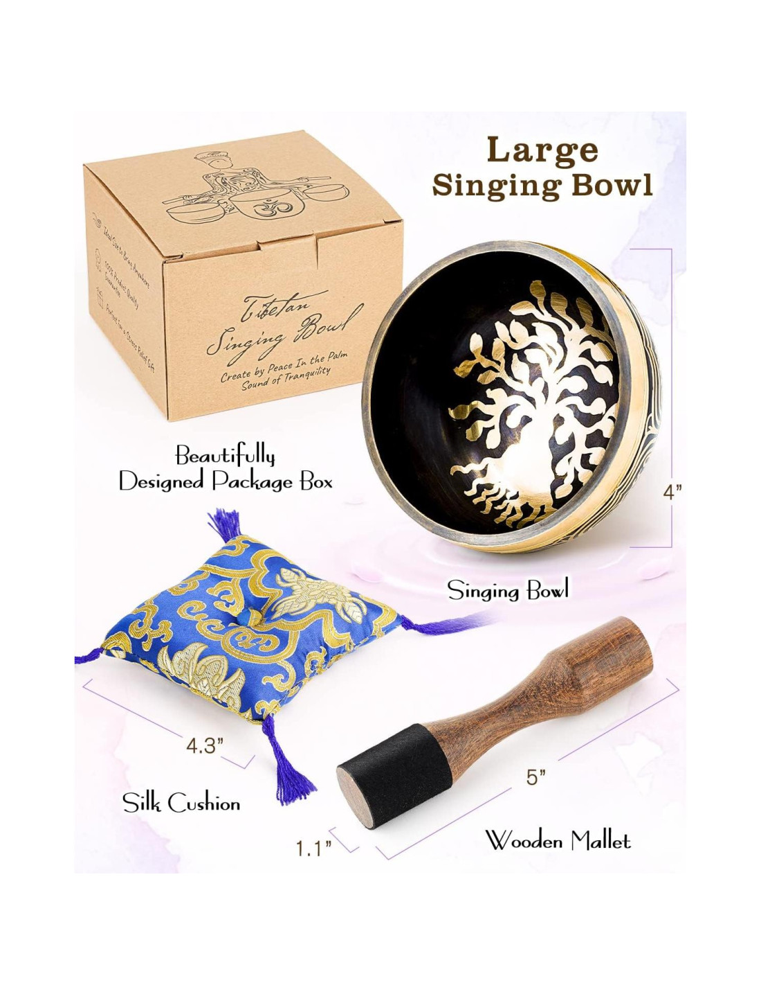 Los cuencos cantores tibetanos están hechos de cobre de fina calidad y otros materiales metálicos. Este conjunto también incluye un mazo de cuenco de madera de rosa, un hermoso anillo de seda y una exquisita caja de regalo lista para obsequiar. 11.43 cm de diámetro (4.5 pulgadas) Mazo de madera envuelto en cuero Cojín de fieltro cosido a mano Estos mantras de seis caracteres son el Mantra de la Gran Compasión Avalokiteshvara, que se deriva del sánscrito y simboliza la compasión y las bendiciones de todos los bodhisattvas, invitando especialmente las bendiciones del Gran Pesimista Avalokiteshvara. 11.43 cm de diámetro (4.5 pulgadas) Mazo de madera envuelto en cuero Cojín de fieltro cosido a mano La talla del árbol de la vida significa valorar la vida y amar la vida, porque se llama así por su árbol inmortal y su fuerte rendimiento de almacenamiento de agua. 11.43 cm de diámetro (4.5 pulgadas) Mazo de madera envuelto en cuero Cojín de fieltro cosido a mano El cuenco se utiliza en todo el mundo en meditación, música, relajación, bienestar personal y espiritual y ceremonias religiosas; psicoterapeutas, masajistas y practicantes de yoga aman sus beneficios curativos únicos. 11.43 cm de diámetro (4.5 pulgadas) Mazo de madera envuelto en cuero Cojín de fieltro cosido a mano El cuenco cantor se utiliza principalmente para ayudar a mejorar la concentración durante la meditación y el canto. Limpie primero el cuenco cantor liso y use una mezcla de tinte y ceniza de la leña para escribir o dibujar patrones en el cuenco. El exterior del cuenco cantor tiene delicados mantras budistas y dibujos florales en el interior. Los cuencos cantores hechos a mano se utilizan en todo el mundo para meditación, música, relajación y bienestar personal. Cuencos Cantores Grandes de 15.24 cm (6 pulgadas) Cuencos Cantores de 10.16 cm (4 pulgadas) Cuencos Cantores de 11.43 cm (4.5 pulgadas) Cuencos Cantores Grandes de 15.24 cm (6 pulgadas) Cuencos Cantores de 10.16 cm (4 pulgadas) Cuencos Cantores Grandes de 15.24 cm (6 pulgadas) Cuencos Cantores de 11.43 cm (4.5 pulgadas) Esperamos que nuestros productos de meditación traigan un nivel de paz, una chispa de pura felicidad y un pensamiento de gratitud a la vida. Todos para uno y uno para todos. También te podría gustar buscar diferentes regalos de meditación en nuestra tienda. Tenemos bancos, almohadas para los ojos y muchos otros grandes accesorios de meditación. ¡Esperamos que te guste!