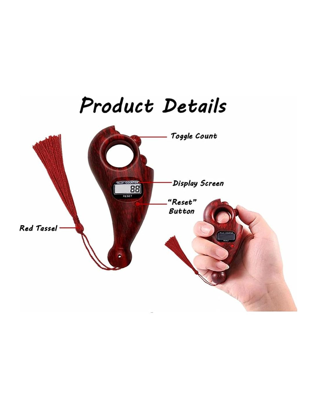 - Fácil de usar: Puedes contar desplazándote con operación sin ruido, y desplazar tu pulgar hacia abajo para comenzar a contar con un rodillo suave. La pantalla del contador de cuentas de oración muestra un contador de 5 dígitos con un rango de conteo de 00000-99999. Puedes reiniciarlo fácilmente a 0 presionando el botón de reinicio.