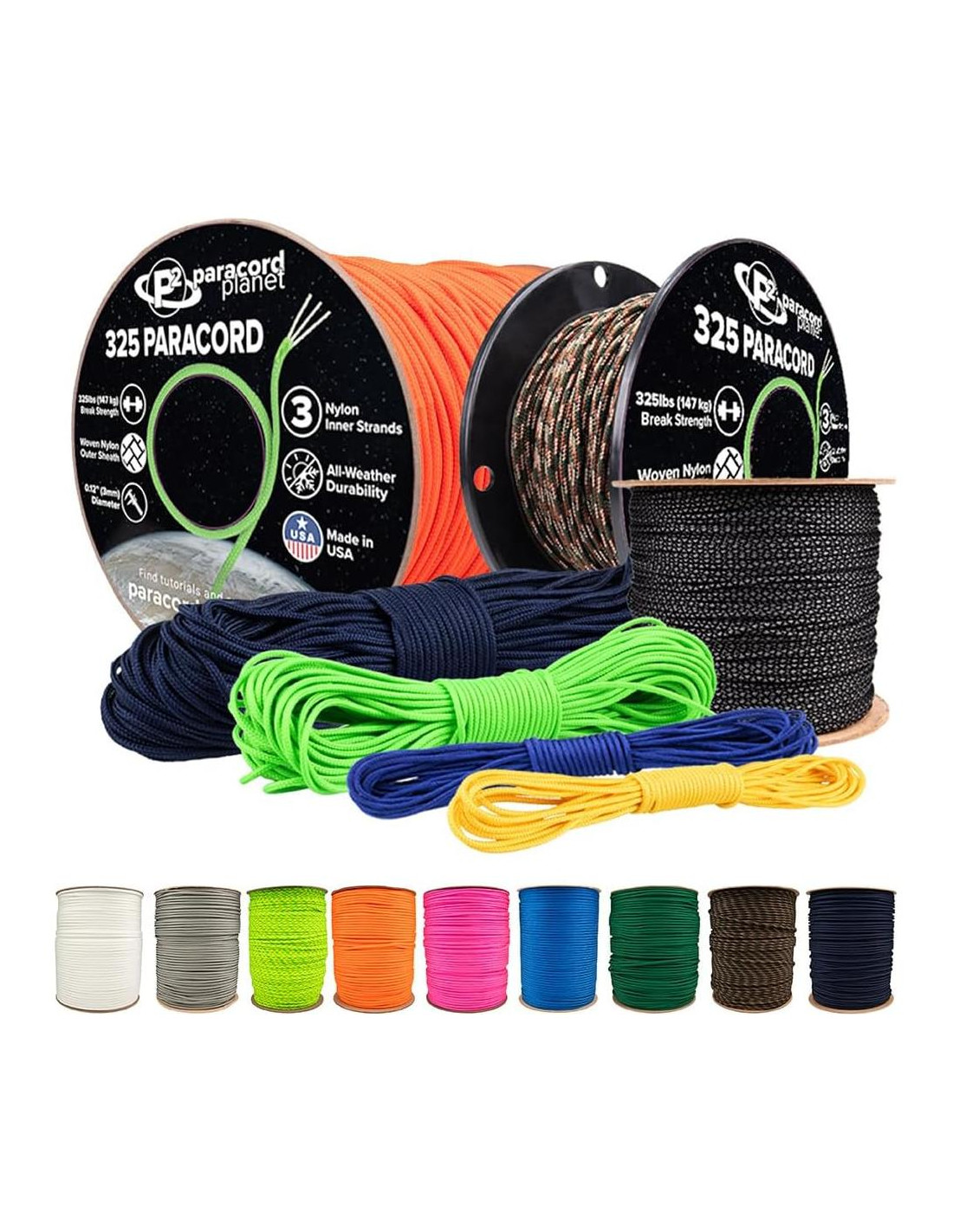 - 325 PARACORD con un diámetro de 3mm y un núcleo interno de 3 hilos hecho de 100% nylon cubierto con una funda de nylon tejido. Soporta cualquier trabajo con una resistencia a la tracción de 147 kg para ataduras confiables, refugios improvisados y transporte de equipos.