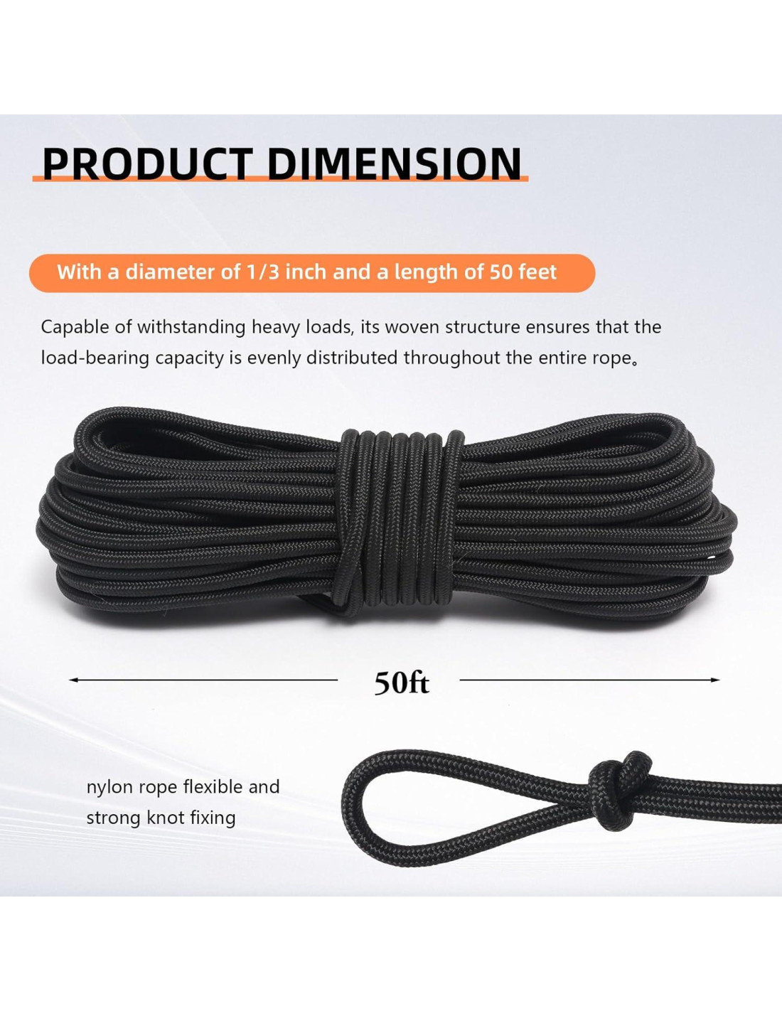 - ESPECIFICACIÓN: Cuerda de nylon disponible en 3 colores (negro/blanco/naranja), diámetro 1/4 pulgada (6mm), 1/3 pulgada (8mm), longitud 50FT (15M), 64FT (20M), 100FT (30M). Capacidad de cuerda de nylon de 6mm: 485lb (220kg), capacidad de carga de la serie de cuerda de nylon de 8mm: 793lb (360kg). Varias especificaciones de cuerdas están disponibles para su elección.