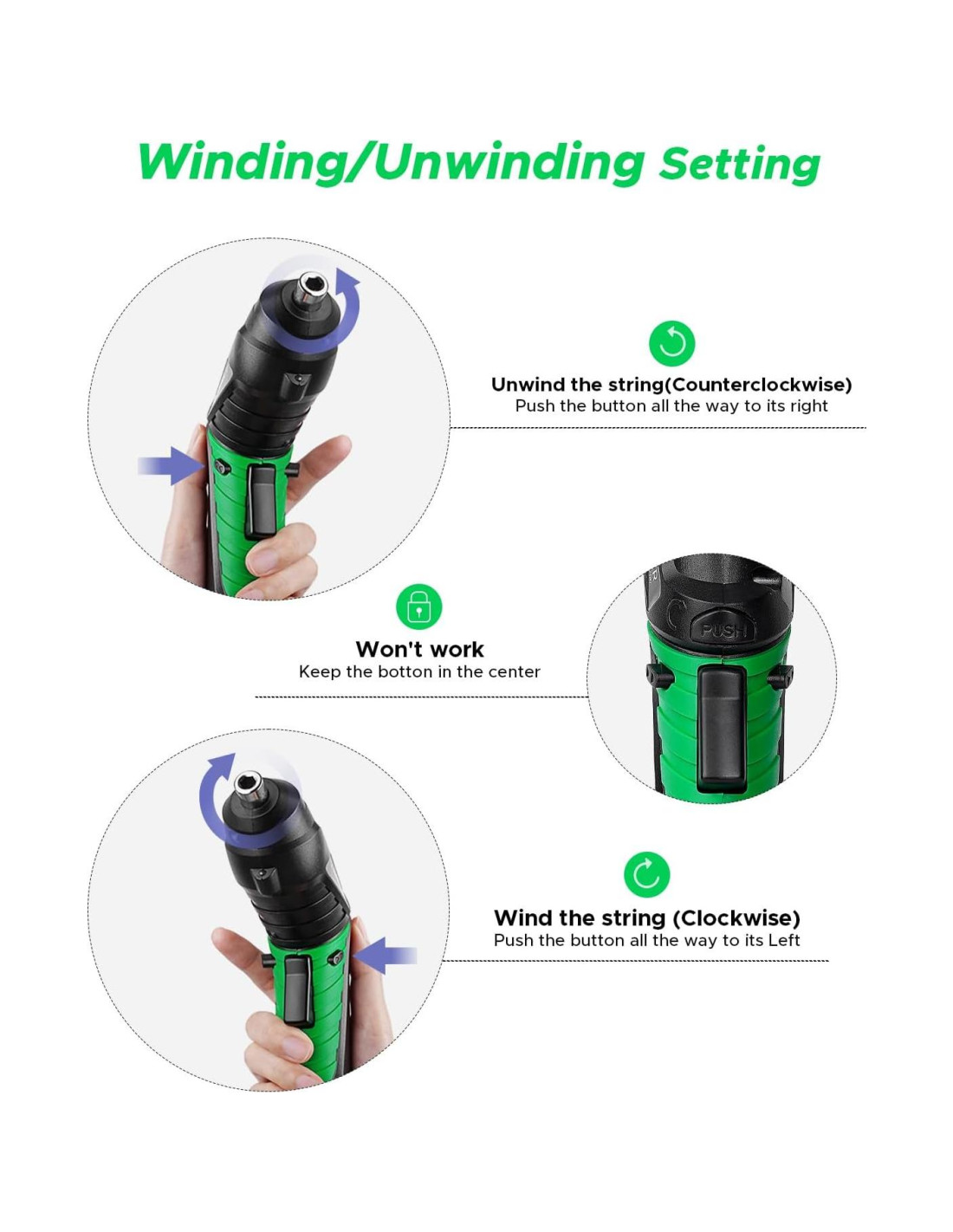 - Winder de Cuerdas Rotativo: El cuerpo del winder se puede ajustar a tipo pistola y tipo recto presionando fácilmente un botón. El botón de Adelante/Reversa en el mango puede ayudar a cambiar suavemente la dirección del tornillo de atornillar a desatornillar. Además, la cabeza del afinador está equipada con una luz LED que se ilumina cuando está en uso, permitiéndote afinar claramente las cuerdas incluso en un backstage oscuro