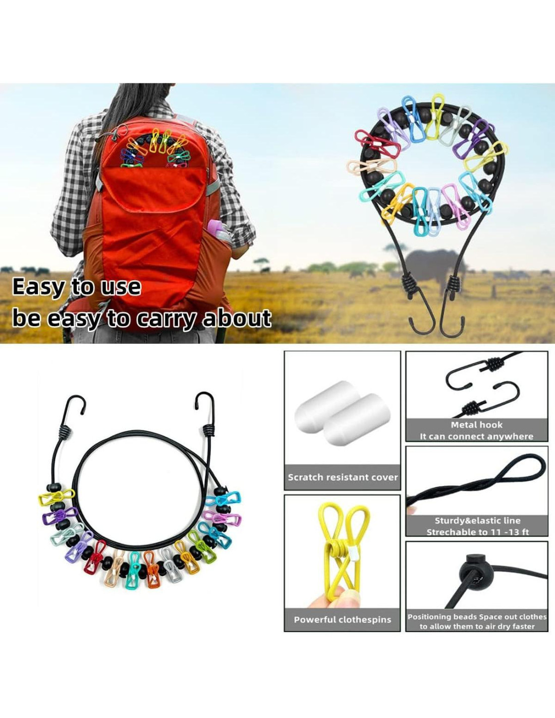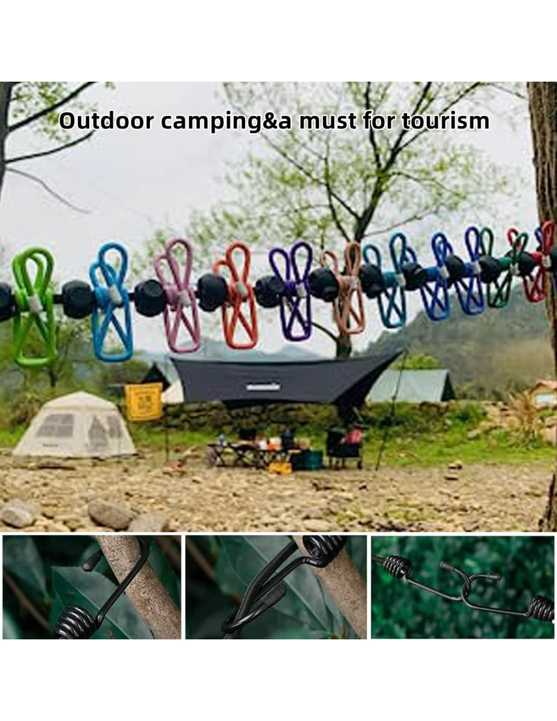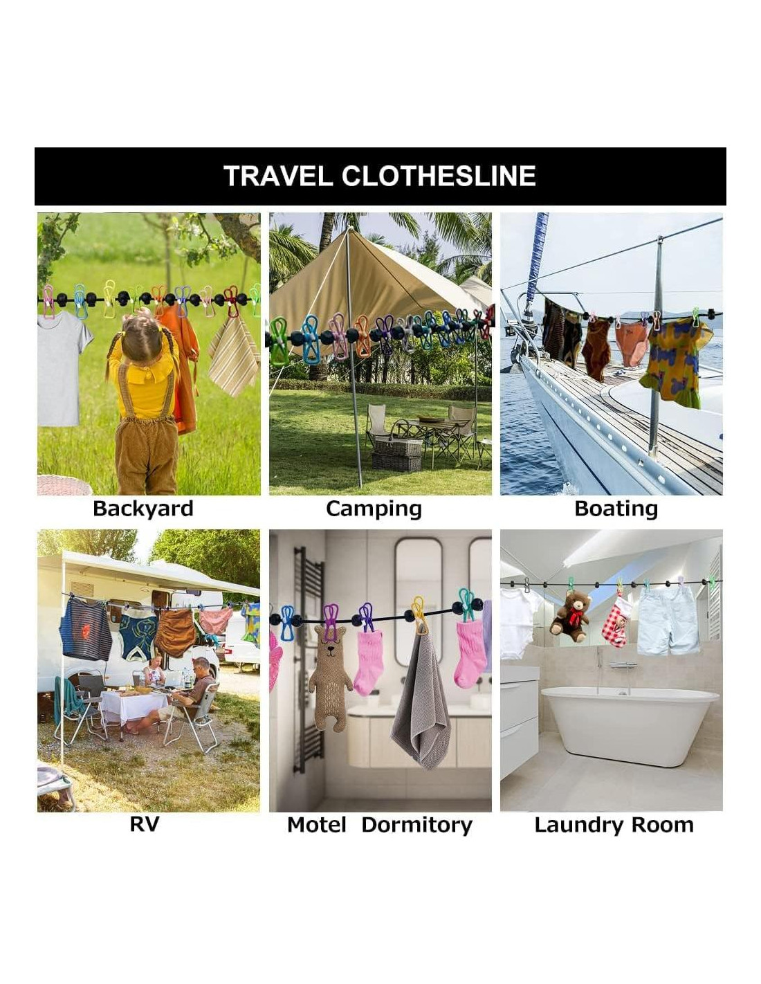 - [Fuerte y Duradero] : cuerda de ropa de alta resistencia fácil de sujetar con dos ganchos de material de acero inoxidable fuertes y fácil de quitar, nuestra cuerda de ropa sin pinzas se puede sujetar en cualquier lugar: casa, balcón, baño, patio trasero, hotel, dormitorio de estudiantes, lavandería, es un buen artículo de camping para adentro o afuera, facilita el lavado, almacenamiento y organización de la ropa.