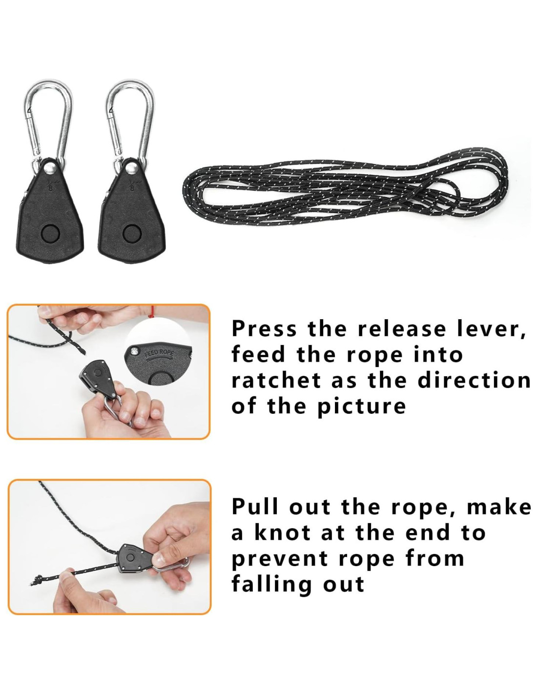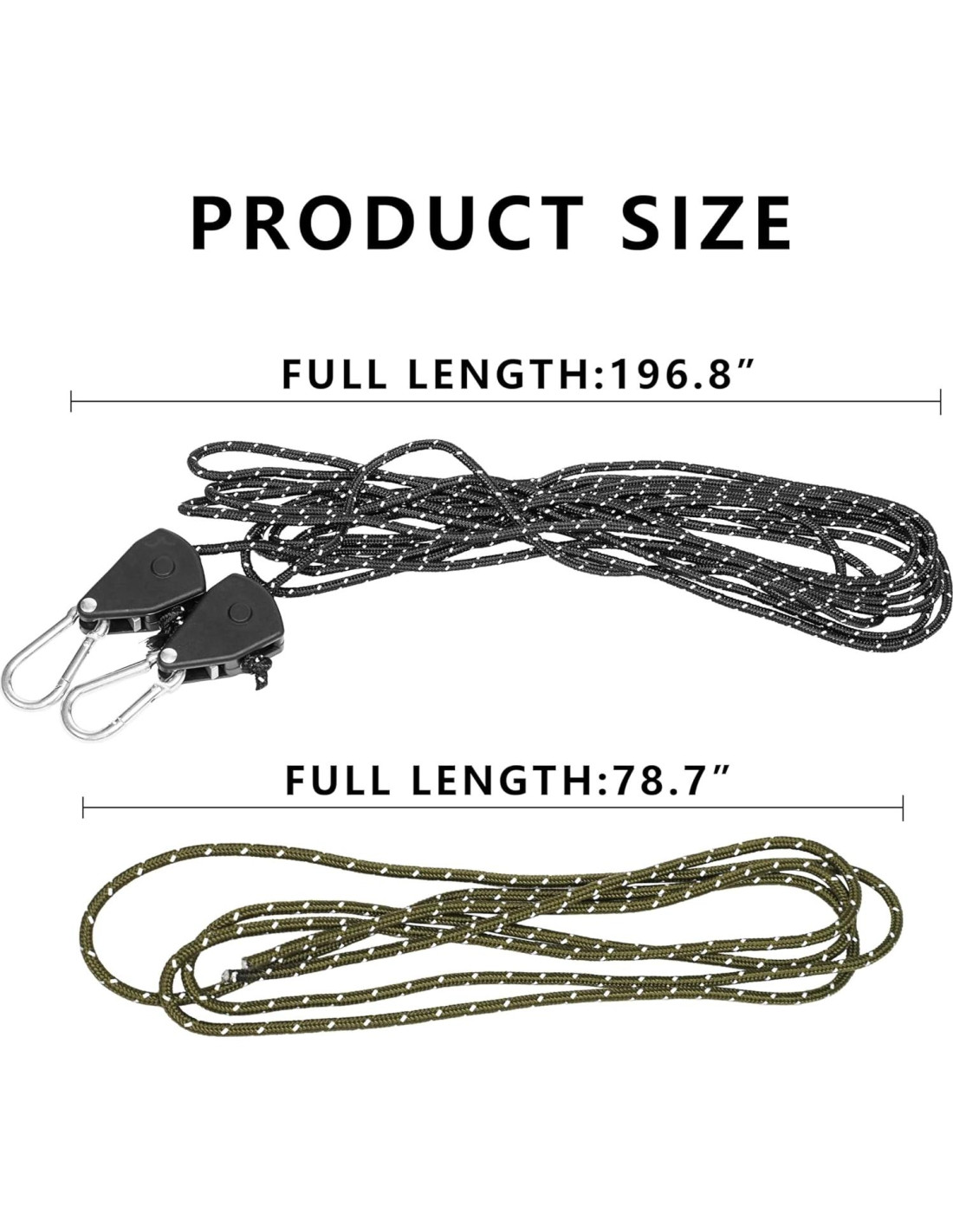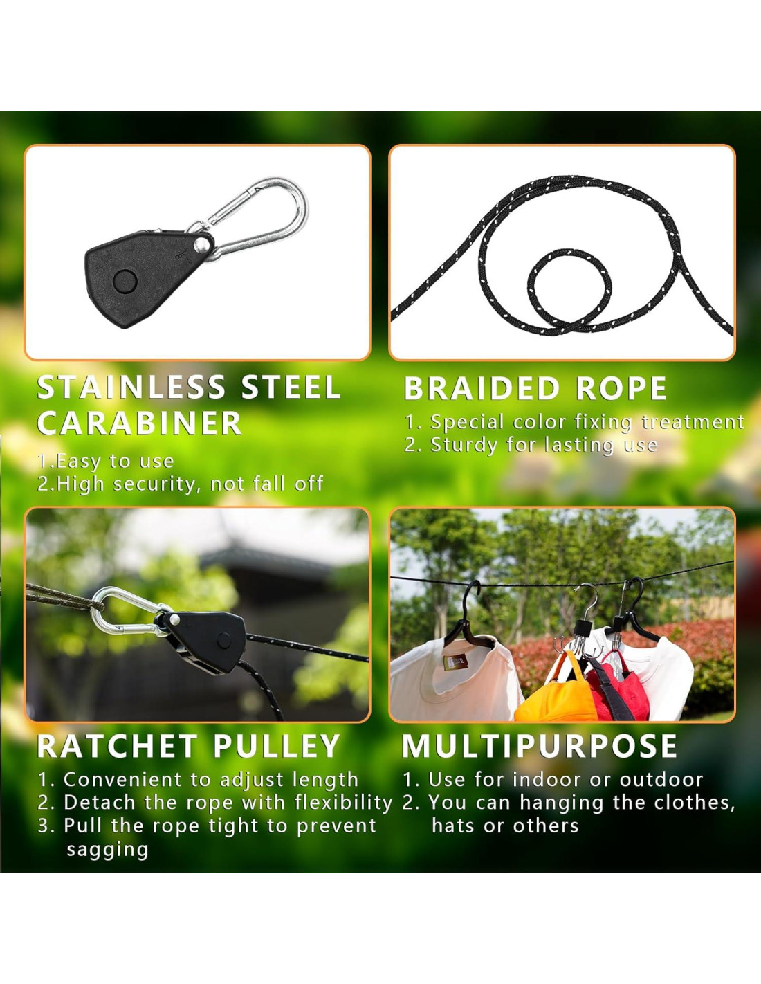 - El kit de secado completo incluye - cuerda de tender negra de 5 m, 2 poleas de trinquete, 2 ganchos de mosquetón seguros y 2 cuerdas adicionales verde oscuro.