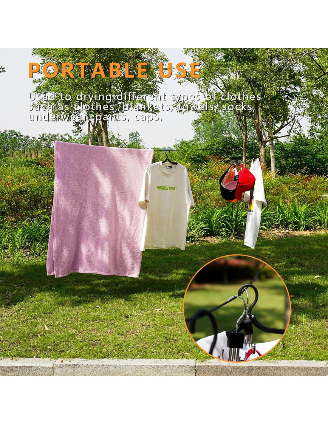 - Portátil y Multiuso - Diseño ligero que viene con dos cuerdas adicionales para uso al aire libre. Ideal para camping, viajes y lavandería en casa.