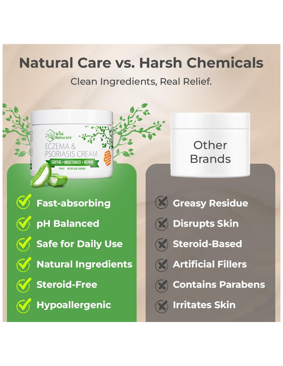 - Calma, Hidrata y Nutre: La crema para eczema y psoriasis Wild Naturals penetra profundamente para ofrecer un poderoso impulso de hidratación y nutrición, dejando la piel equilibrada y saludable. Esta loción para psoriasis y crema de miel para eczema está especialmente formulada con aloe vera calmante e hidratante como su ingrediente base, no agua como la mayoría de los productos para el cuidado de la piel.