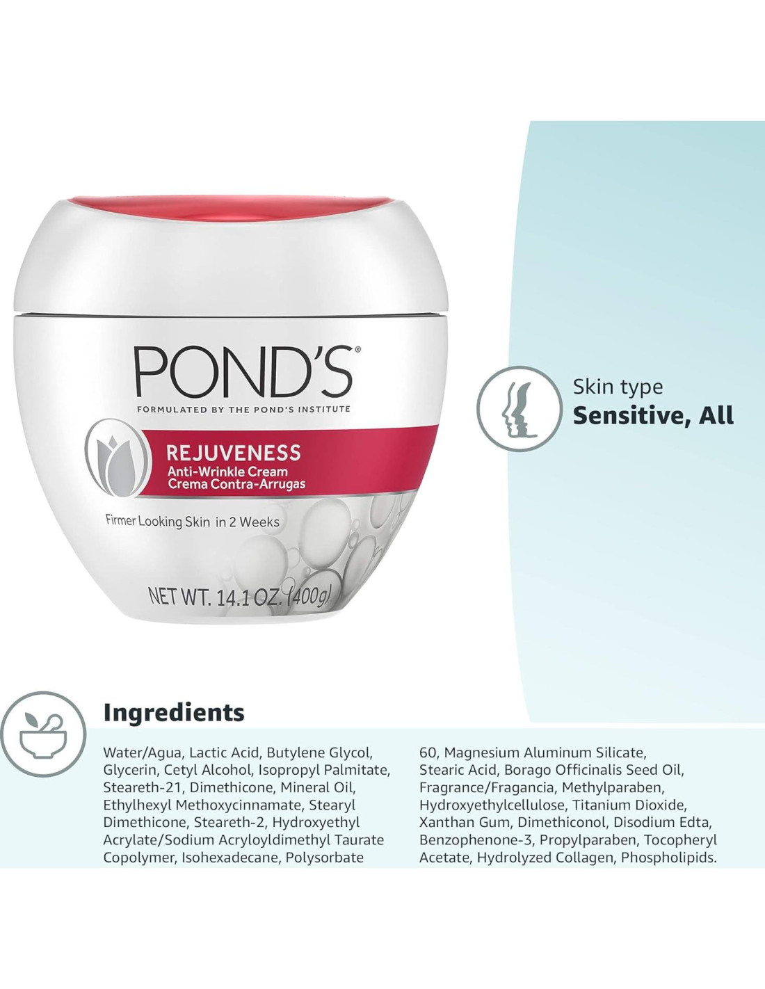 Experimenta el poder de la Crema Facial Hidratante Antiarrugas POND'S Rejuveness y despídete de las líneas finas y arrugas. Nuestra fórmula hipoalergénica y probada por dermatólogos está especialmente diseñada para reducir visiblemente la apariencia de arrugas y líneas finas en solo 2 semanas a través de una poderosa mezcla de ingredientes esenciales que suavizan la piel. Formulada con Ácidos Alfa Hidróxidos (AHA), un exfoliante vital conocido por reducir signos de sequedad, envejecimiento y más, ayuda a eliminar suavemente las células muertas de la superficie de la piel y suavizar la apariencia de las líneas finas, revelando una apariencia más firme y fresca. El colágeno, un ingrediente clave, trabaja para aumentar la fuerza y elasticidad de la piel, mientras que la Vitamina E, un antioxidante conocido por sus propiedades hidratantes, hidrata profundamente y nutre la piel desde adentro. Incorpora la Crema Facial Antiarrugas POND'S Rejuveness en tu rutina diaria de cuidado de la piel. Úsala por la mañana como base antes de aplicar tu maquillaje y como crema nocturna después de limpiar. Deja que la ciencia y la tecnología de POND'S te brinden una piel suave y sedosa libre de líneas finas. Únete a las filas de entusiastas del cuidado de la piel que han abrazado la magia de este clásico atemporal. Los productos de cuidado de la piel POND'S han sido favoritos queridos durante generaciones, brindando piel suave, lisa y radiante a quienes buscan lo mejor durante más de 170 años. ¡Experimenta la diferencia y disfruta del tratamiento de cuidado de la piel definitivo!