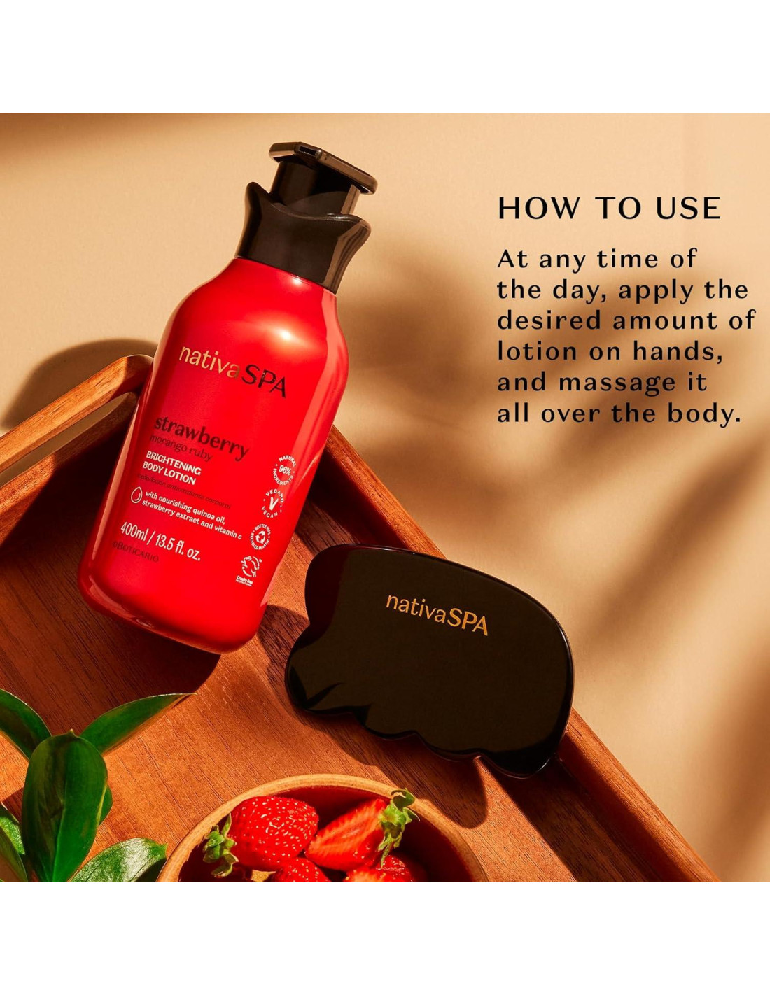 - Poder Antioxidante: La Loción Corporal Antioxidante de Fresa Rubí de Nativa Spa aprovecha el poder antioxidante de los extractos de fresa. Rica en vitamina C y antioxidantes, las fresas ayudan a proteger tu piel de los radicales libres, promoviendo una apariencia saludable y rejuvenecida.