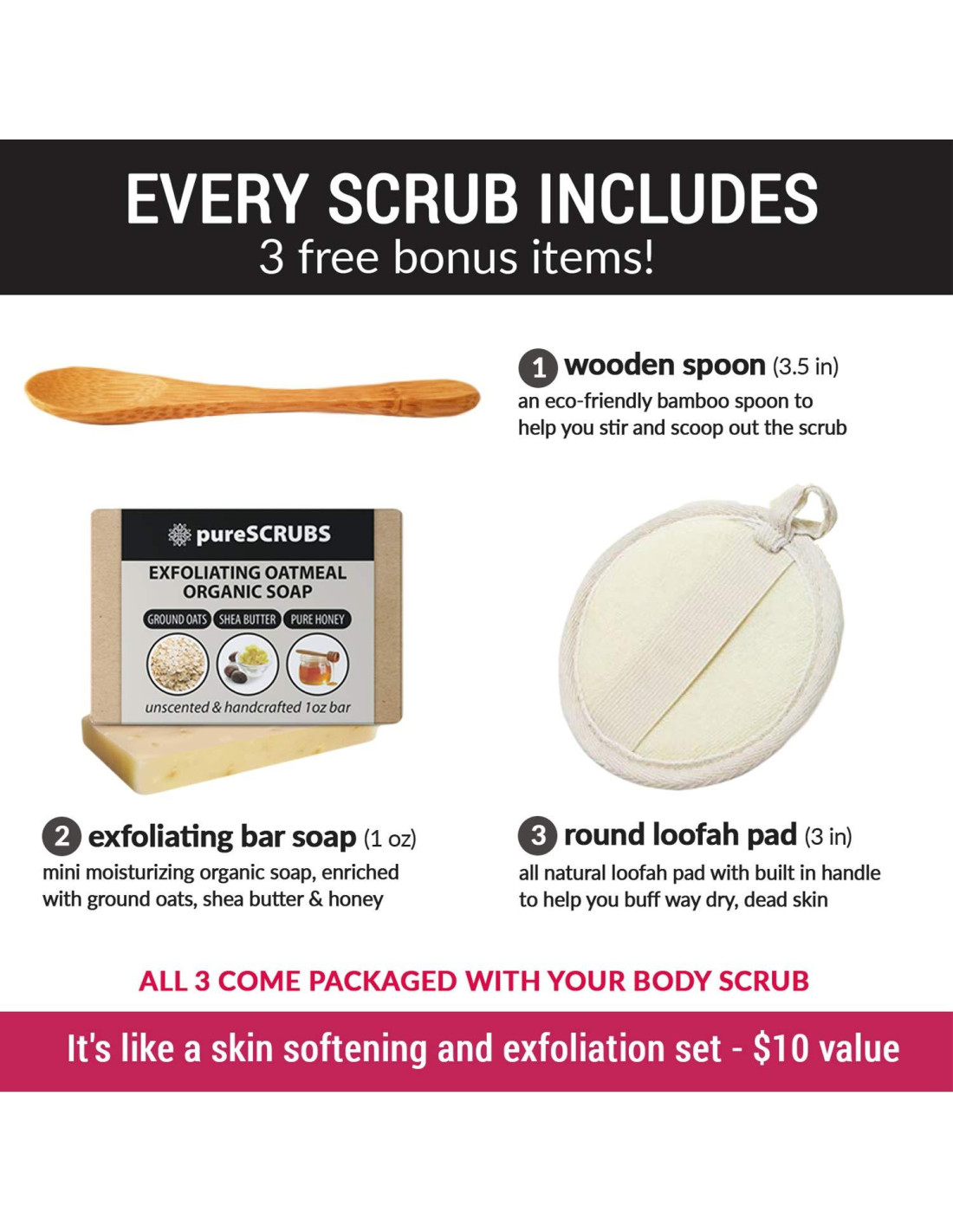 - INCLUYE TRES (3) ACCESORIOS ADICIONALES - (1) Una linda cuchara de madera ecológica para ayudarte a revolver y sacar el exfoliante. (2) Un almohadilla de esponja exfoliante natural redonda para ayudar a eliminar la piel seca y muerta. (3) Un jabón de barra orgánico exfoliante de avena (tamaño 1oz) hecho con avena molida, manteca de karité y miel. ¡Es como un kit completo de suavizado y exfoliación de piel que también es un gran regalo!