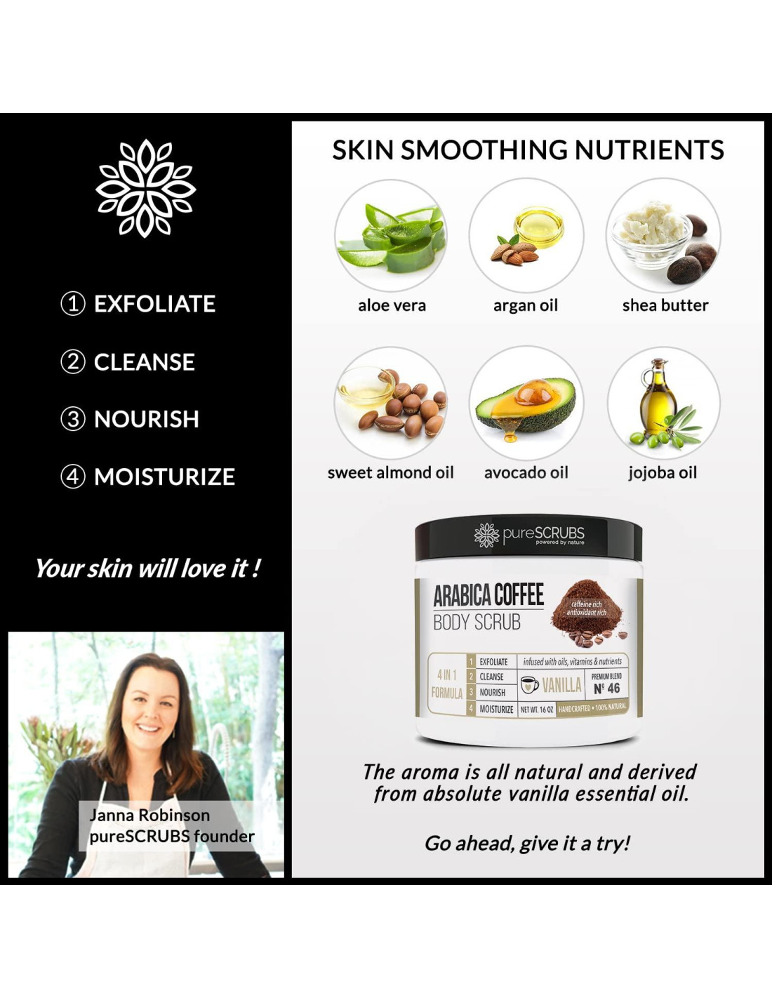 - OBTÉN UNA PIEL ULTRA SUAVE RÁPIDO - ¡ESTO FUNCIONA! Nuestra única 'Fórmula 4 en 1' hace todo lo que un exfoliante corporal debería hacer y más - EXFOLIAR, LIMPIAR, NUTRIR Y HIDRATAR. Café arabica finamente molido mezclado con sal del Mar Muerto e infusionado con aceites esenciales orgánicos, nutrientes transformarán tu piel haciéndola suave, saludable y radiante.