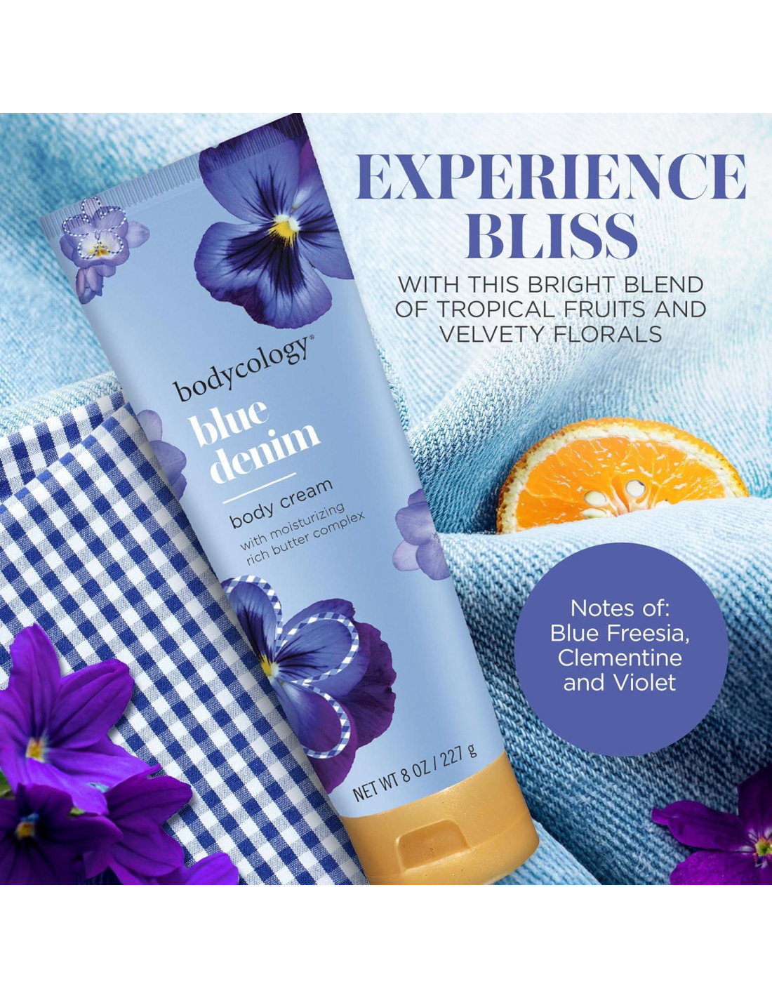 Mímate con esta brillante mezcla de frutas tropicales ligeras y flores aterciopeladas cuando te hidrates con la Crema Corporal Denim Azul de Bodycology. Tu piel te lo agradecerá por usar nuestra fórmula ultra hidratante y no grasa de manteca de karité, manteca de cacao y aceite de jojoba. Cuando apliques nuestra Crema Denim Azul en tu piel, te rodearás de una brillante mezcla de flor de manzana, pétalos de violeta y vainilla azucarada junto con la dulce atracción de fresia azul, con notas base de almizcle de denim y sándalo para completar la experiencia. Usa esta crema perfumada como una forma de cuidado personal especial o hazla parte de tu ritual diario de belleza. Para una fragancia de todo el día, combina con el Mist de Fragancia Denim Azul de Bodycology o con nuestros otros mist de Bodycology para crear tu propia fragancia única. Todos los productos de Bodycology son libres de parabenos, ftalatos y no son probados en animales.