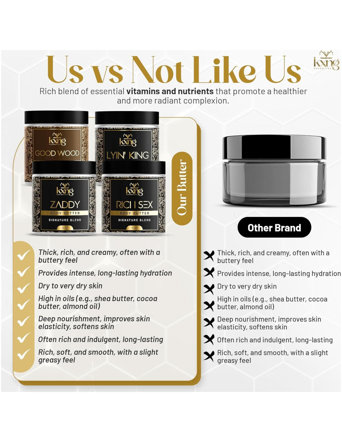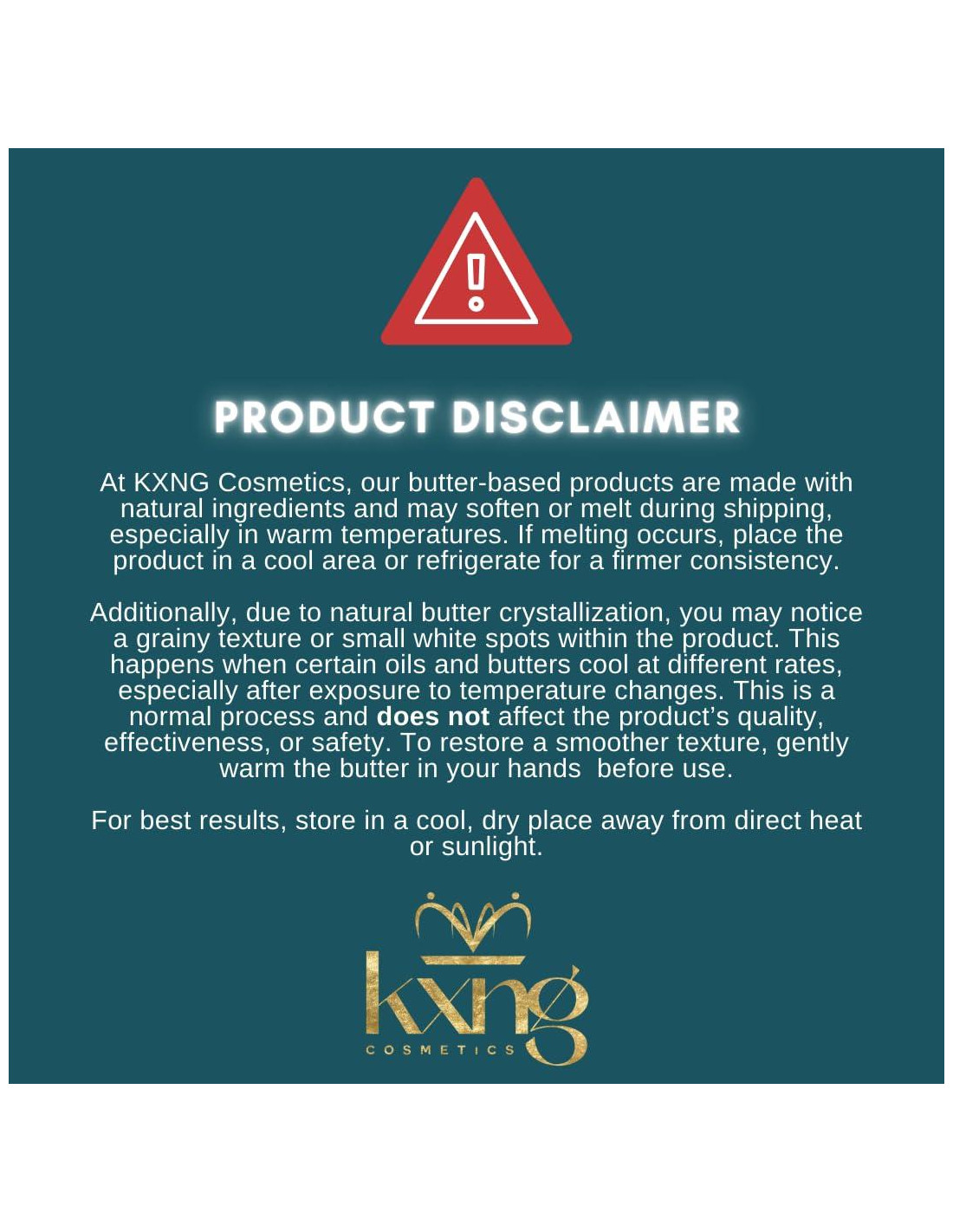 Creado para reyes y reinas - nuestras mezclas naturales suavizan, nutren y definen tu apariencia con propósito, poder y presencia innegable. KXNG Cosméticos fue creado para hombres y mujeres que lideran con confianza y viven con intención. Nuestros productos de cuidado personal premium están hechos con ingredientes naturales y ricos en nutrientes que suavizan, hidratan y elevan tu apariencia. Ya sea manteca para barba o cuidado corporal, cada fórmula está diseñada para ayudarte a sentirte como realeza - porque verse bien nunca debería ser opcional. ¿Qué hace que la manteca corporal de KXNG Cosméticos sea diferente de la loción regular u otras mantecas corporales? Nuestro producto está lleno de ingredientes naturales que penetran profundamente en la piel, reteniendo la humedad. Usamos una combinación de 4 mantecas únicas y 8 aceites para proporcionar una plétora de beneficios para la piel que puedes sentir inmediatamente al aplicarlo. ¿Esta manteca corporal dejará mi piel sintiéndose grasosa? No, nuestra fórmula se derrite al contacto y se absorbe rápidamente - dejando tu piel suave, lisa y no grasosa con un acabado satinado. Si el producto se vuelve demasiado aceitoso al aplicarlo, aplica una cantidad más pequeña. Una pequeña aplicación rinde mucho. ¿Es KXNG Cosméticos adecuado para piel sensible? Sí. Usamos solo ingredientes naturales de alta calidad sin químicos agresivos. Sin embargo, siempre recomendamos una prueba de parche antes de su uso completo - especialmente si tienes piel sensible o alergias. ¿Esta manteca corporal ayuda con la piel seca y agrietada? Sí. Nuestra mezcla rica en nutrientes de manteca de karité, aceite de coco y aceites esenciales calma y restaura la piel seca e irritada - convirtiéndola en una opción ideal para personas que lidian con áreas ásperas. ¿Por qué llegó mi manteca corporal derretida? Porque usamos solo ingredientes naturales sin estabilizadores sintéticos, tu manteca corporal puede derretirse en tránsito durante los meses más cálidos. No te preocupes, sigue siendo perfectamente seguro y efectivo. Colócalo en el refrigerador durante unos 15-20 minutos para restaurar la textura.