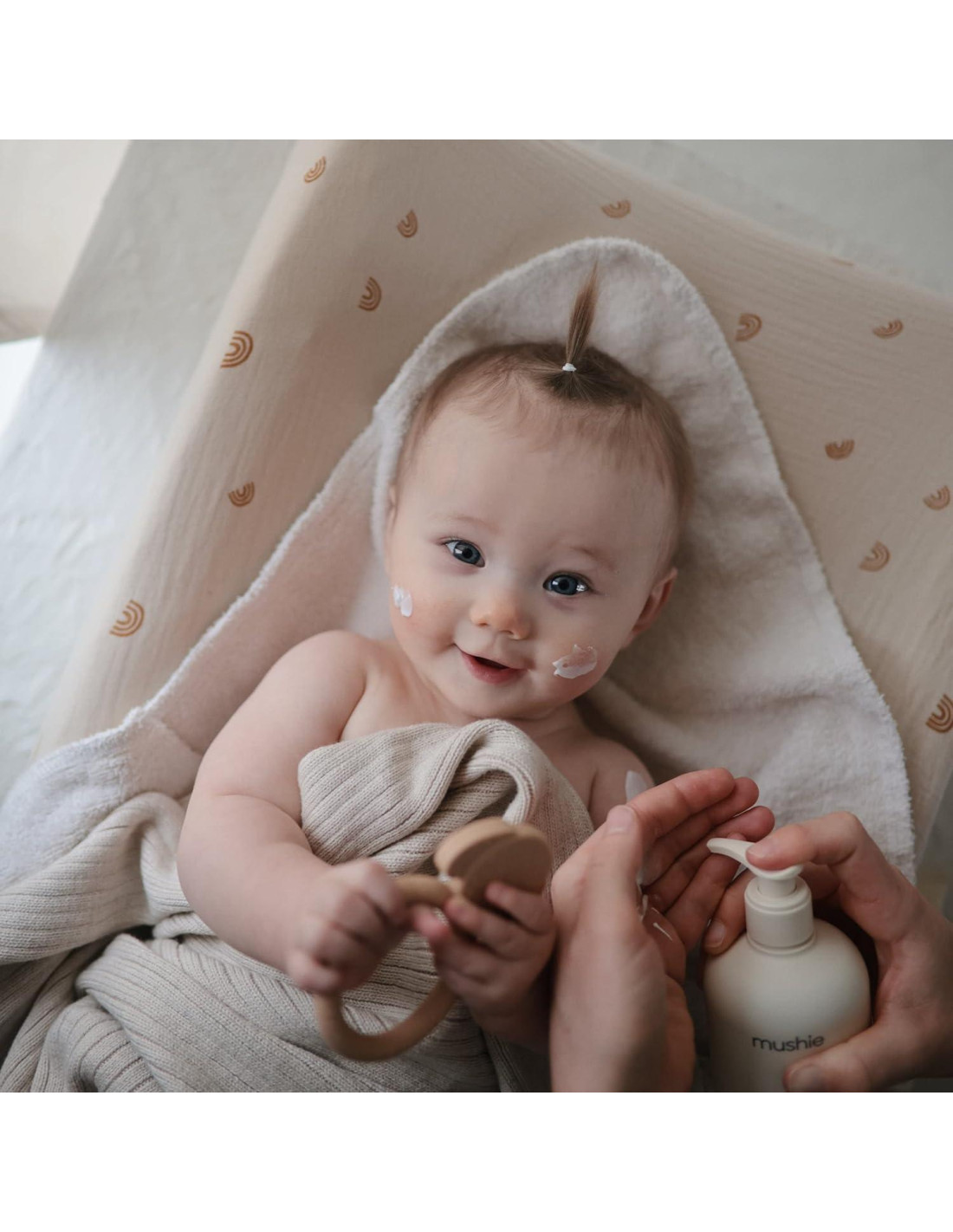 - Calma e hidrata la piel de tu bebé con la Loción Corporal para Bebés de Mushie. Derivada de ingredientes naturales, nuestra fórmula protege e hidrata la piel seca mientras deja a tu pequeño súper suave de pies a cabeza.