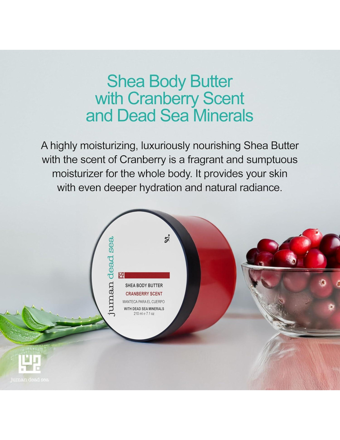 NUESTRA FILOSOFÍA: En Juman, creemos que mereces lo mejor que la naturaleza tiene para ofrecer. Por eso te traemos el poder rejuvenecedor de los minerales del Mar Muerto, cuidadosamente infusionados en nuestras formulaciones para el cuidado de la piel para nutrir, hidratar y revitalizar tu piel. Nuestra misión es ayudarte a experimentar los beneficios transformadores de esta maravilla natural, para que puedas disfrutar de un cutis más saludable y radiante cada día. LO QUE HACE: Una manteca altamente hidratante y lujosamente nutritiva con el aroma de Arándano es un hidratante fragante y suntuoso para todo el cuerpo. Proporciona a tu piel una hidratación aún más profunda y un brillo natural. FÁCIL DE USAR: Aplica una cantidad adecuada en el cuerpo o en el área requerida, y luego masajea suavemente hasta que se absorba por completo. Para obtener los mejores resultados, úsalo diariamente después de bañarte o en cualquier momento que la piel necesite hidratación. LIBRE DE SLS Y PARABENOS: Nuestros productos están libres de ingredientes dañinos, permitiéndote disfrutar de una experiencia de cuidado de la piel suave, segura y nutritiva sin comprometer la efectividad. Experimenta el tratamiento de spa de la naturaleza con minerales del Mar Muerto.
