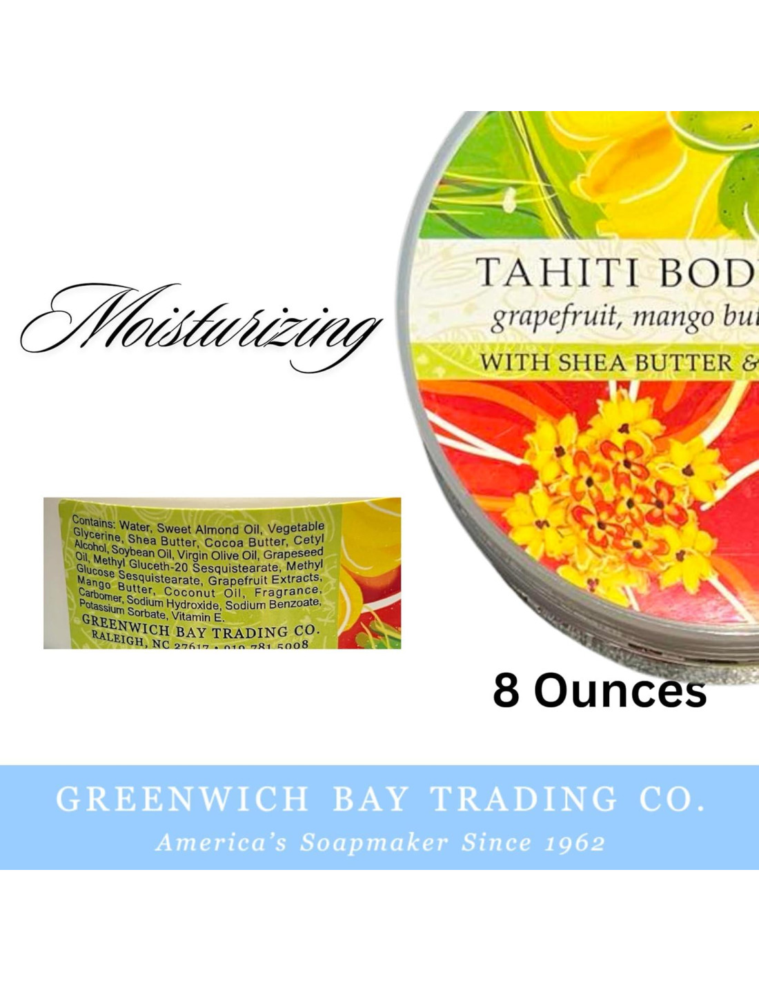 Transporta tus sentidos a un paraíso tropical con la Manteca Corporal de Destino Tahití de Greenwich Bay Trading. Infundida con una mezcla exótica de pomelo, mango y aceite de coco, esta rica manteca corporal proporciona hidratación intensa y deja tu piel suave, lisa y bellamente nutrida. Mejorada con manteca de karité y aceites botánicos, hidrata profundamente tu piel mientras retiene la hidratación para un brillo radiante que dura todo el día. Te encantará la refrescante fragancia tropical de pomelo y mango, que estimula tus sentidos y trae la esencia de Tahití a tu rutina diaria. La fórmula cremosa se absorbe rápidamente sin dejar residuos grasos, lo que la hace perfecta para el uso diario o después de un día al sol. Mima tu piel con esta lujosa manteca corporal y disfruta de sus efectos rejuvenecedores en piel seca o apagada. Empaquetada en un conveniente tarro de 227g, esta manteca corporal es perfecta para el deleite en casa o para viajar. Ya sea que busques consentirte a ti mismo o a alguien especial, es la forma definitiva de mantener tu piel nutrida, radiante y bellamente perfumada.