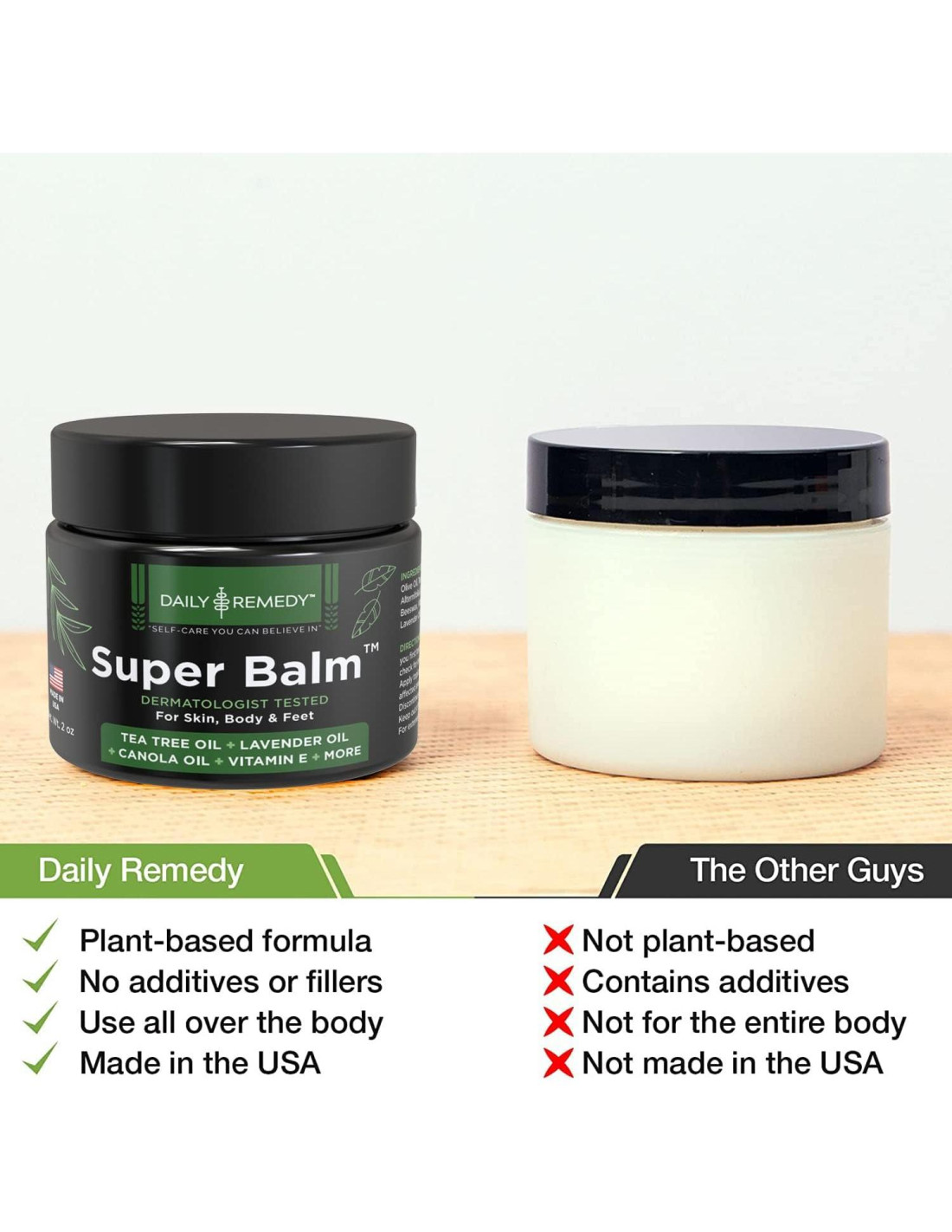 El Bálsamo Super es excelente para ayudar a combatir una variedad de problemas de piel en la cara, cuerpo, pies, manos, cuero cabelludo, uñas de los dedos de las manos, uñas de los dedos de los pies y talones. Esta fórmula versátil penetra profundamente para llegar a la raíz del problema y eliminarlo. Los ingredientes naturales también ayudan a prevenir futuros brotes. Cuando confías en Daily Remedy, obtienes un producto que no contiene parabenos, químicos, toxinas, fragancias artificiales y otros desechos que incluyen los productos de venta libre típicos. El Bálsamo Super es una mezcla calmante de Aceite de Coco, Aceite de Oliva, Aceite de Árbol de Té, Aceite de Eucalipto Australiana, Aceite de Lavanda, Vitamina E, Vitamina C y más. Las elecciones que hacemos en la vida tienen un impacto directo en los animales y el medio ambiente. Lo tenemos en cuenta al crear todas nuestras fórmulas naturales. Proporcionar productos libres de crueldad a nuestros clientes es un elemento esencial en la misión de Daily Remedy. Queremos asegurar la seguridad y el bienestar de los animales mientras proporcionamos productos que son mejores para ti y el planeta. Puede que hayas probado otros remedios naturales y holísticos en el pasado solo para decepcionarte. Esperamos cambiar el juego cuando se trata de tomar la ruta natural para transformar tu piel, uñas y pies. Estamos seguros de que verás resultados asombrosos y te unirás a las filas de miles de otros clientes felices que eligieron Daily Remedy. Si no puedes controlar problemas comunes y persistentes de la piel como el eczema, el pie de atleta, el tiña, la picazón de ingle y otras irritaciones, entonces estás en el lugar correcto. Este tópico fácil de aplicar eliminará estos molestos problemas, para que finalmente puedas dejarlos atrás de una vez por todas. ¿Hay algo más frustrante que los problemas de piel que causan irritación y picazón incesantes? Si has estado allí o actualmente estás luchando con ello, necesitas probar el Bálsamo Super. Los poderosos ingredientes calmantes derrotarán las erupciones, el enrojecimiento, la picazón y evitarán que la irritación se propague. A nadie le gusta mirar su piel y horrorizase por lo que ve. Queremos que estés orgulloso de la apariencia y sensación de tu piel y uñas. Con el Bálsamo Super, estarás sonriendo de oreja a oreja. Ayudará a nutrir, limpiar, suavizar y eliminar impurezas de tu piel mientras transforma tus uñas. Vas a estar orgulloso de mostrar el resultado. En Daily Remedy, no escatimamos en gastos. Buscamos por todas partes para obtener los mejores ingredientes naturales para usar en nuestras mezclas patentadas. Nunca hay aditivos, rellenos, aglutinantes u otros ingredientes potencialmente dañinos. Todos nuestros productos se fabrican en EE. UU. bajo estrictas normas y regulaciones de seguridad.