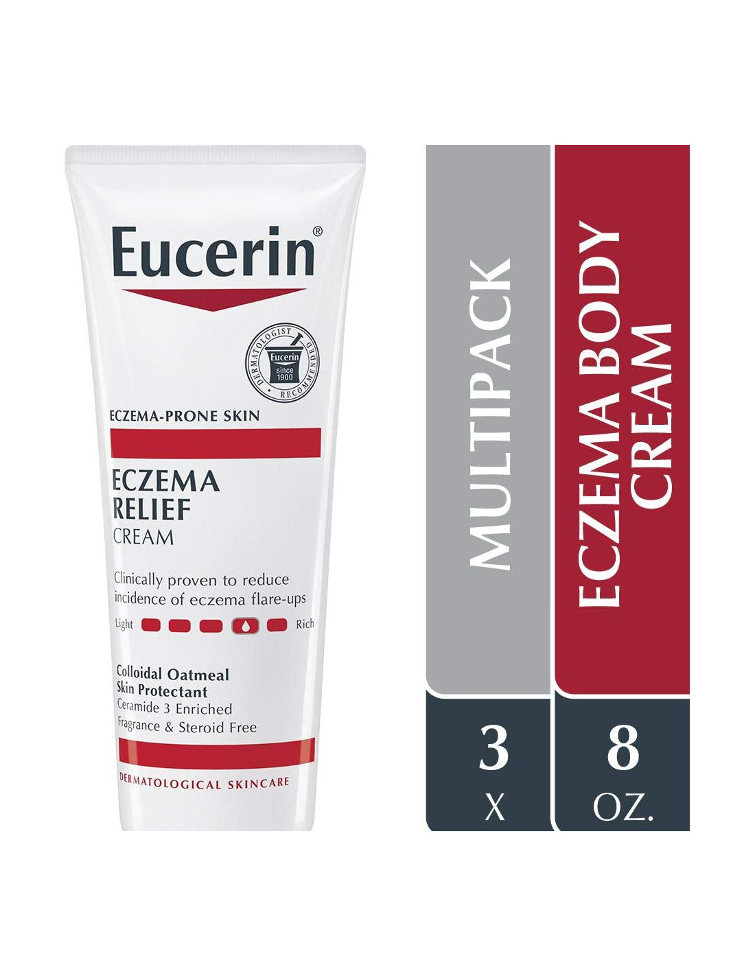 - Incluye tres (3) tubos de 226.8 gramos de Crema Corporal Eucerin para el Alivio del Eczema