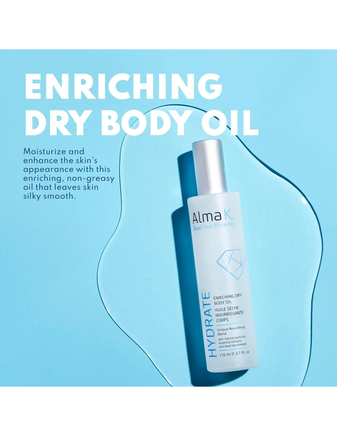 - Ingredientes Naturales: El spray de aceite corporal secante enriquecedor Alma K presenta aceites de aguacate, oliva, argán y almendra dulce, combinados con vitamina E y minerales del Mar Muerto. Esta mezcla nutre la piel, proporcionando hidratación y promoviendo una sensación sedosa y suave.