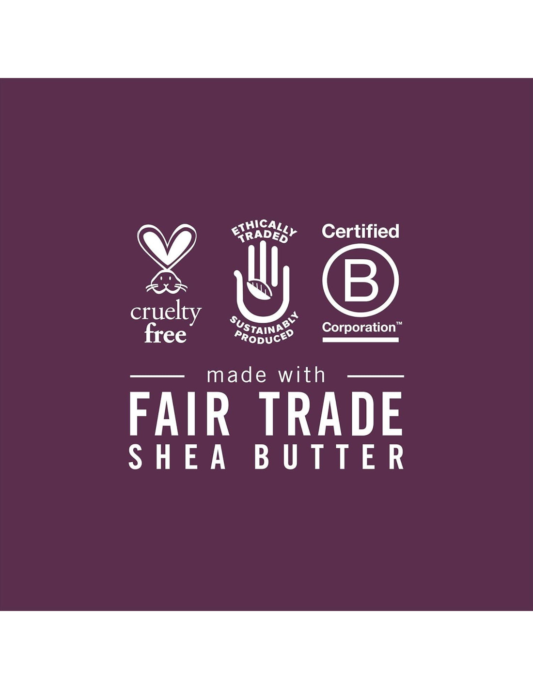 - Manteca de Karité 100% certificada orgánica, obtenida éticamente de cooperativas de mujeres en el norte de Ghana en esta crema corporal