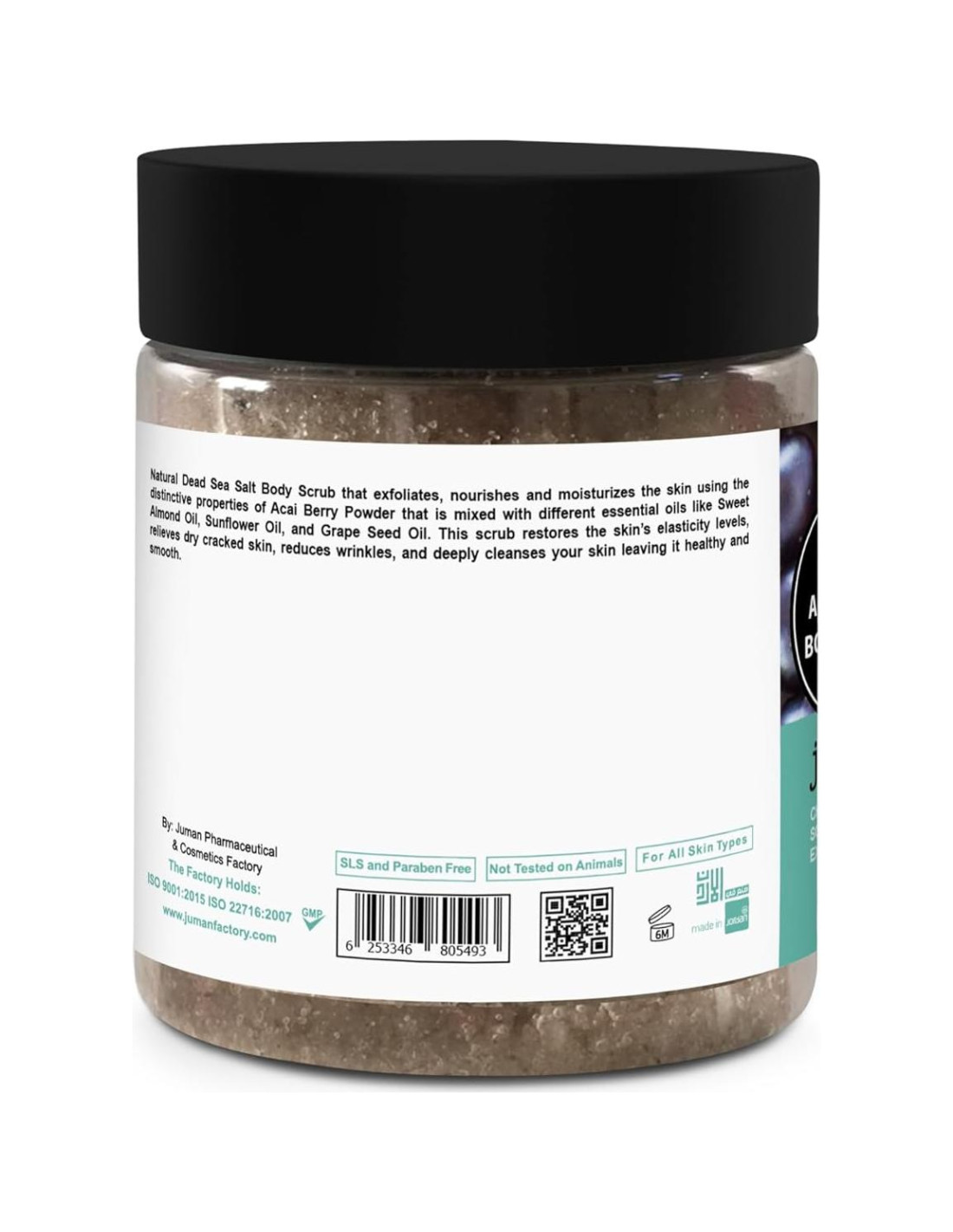 Desata el poder de la Baya con nuestro exfoliante elaborado con minerales del Mar Muerto y Extracto de Acai. Con los beneficios añadidos de aceites esenciales como Aceite de Almendra Dulce, Aceite de Girasol y Aceite de Semilla de Uva, este exfoliante ayuda a restaurar la elasticidad de la piel, eliminar las células muertas de la piel y rejuvenecer la piel opaca para impartir un brillo juvenil. INGREDIENTES: Maris Sal (Sal del Mar Muerto), Helianthus Annuus (Girasol) Aceite de Semilla, Aloe Barbadensis (Aloe Vera) Aceite de Hoja, Theobroma Cacao (Cacao) Manteca de Semilla, Argania Spinosa (Argán) Aceite de Núcleo, Acai (Euterpe Oleracea) Polvo, Butyrospermum Parkii (Manteca de Karité) Fruto, Prunus Amygdalus Dulcis (Almendra Dulce) Aceite, Vitis Vinifera (Uva) Aceite de Semilla, Tocopherol (Vitamina E). Maris Sal (Sal del Mar Muerto): Sales orgánicas ricas en magnesio que mejoran la hidratación de la piel y reducen la inflamación en la piel seca. Helianthus Annuus (Girasol) Aceite de Semilla: una gran fuente de vitamina E, rica en nutrientes y antioxidantes, y es efectiva para combatir problemas de cuidado de la piel, también tiene propiedades emolientes que ayudan a la piel a retener su humedad. Aceite de Hoja de Aloe Vera: tiene poderosas propiedades curativas probadas efectivas en el tratamiento de quemaduras solares y reducción de la visibilidad de cicatrices, también actúa como un agente hidratante. Manteca de Semilla de Cacao: tiene altos niveles de antioxidantes que ayudan a reparar la piel del daño solar y el envejecimiento, también calma el enrojecimiento y las imperfecciones. Acai (Euterpe Oleracea) Polvo: este polvo denso en nutrientes que está cargado de antioxidantes para combatir los signos de envejecimiento. Es rico en vitaminas A, B, C y E que revive tu piel, sana las células dañadas de la piel y restaura la humedad. INSTRUCCIONES DE USO: Mezcla primero la cáscara. Aplica generosamente en el área requerida del cuerpo (preferiblemente sobre la piel seca y limpia). Masajea suavemente en un movimiento circular, deja el exfoliante en tu piel durante unos minutos y luego enjuaga con agua tibia. Se recomienda usarlo (1-2) veces a la semana. INFORMACIÓN DEL PRODUCTO: - CPNP: 3510457 - Peso: 324.5g