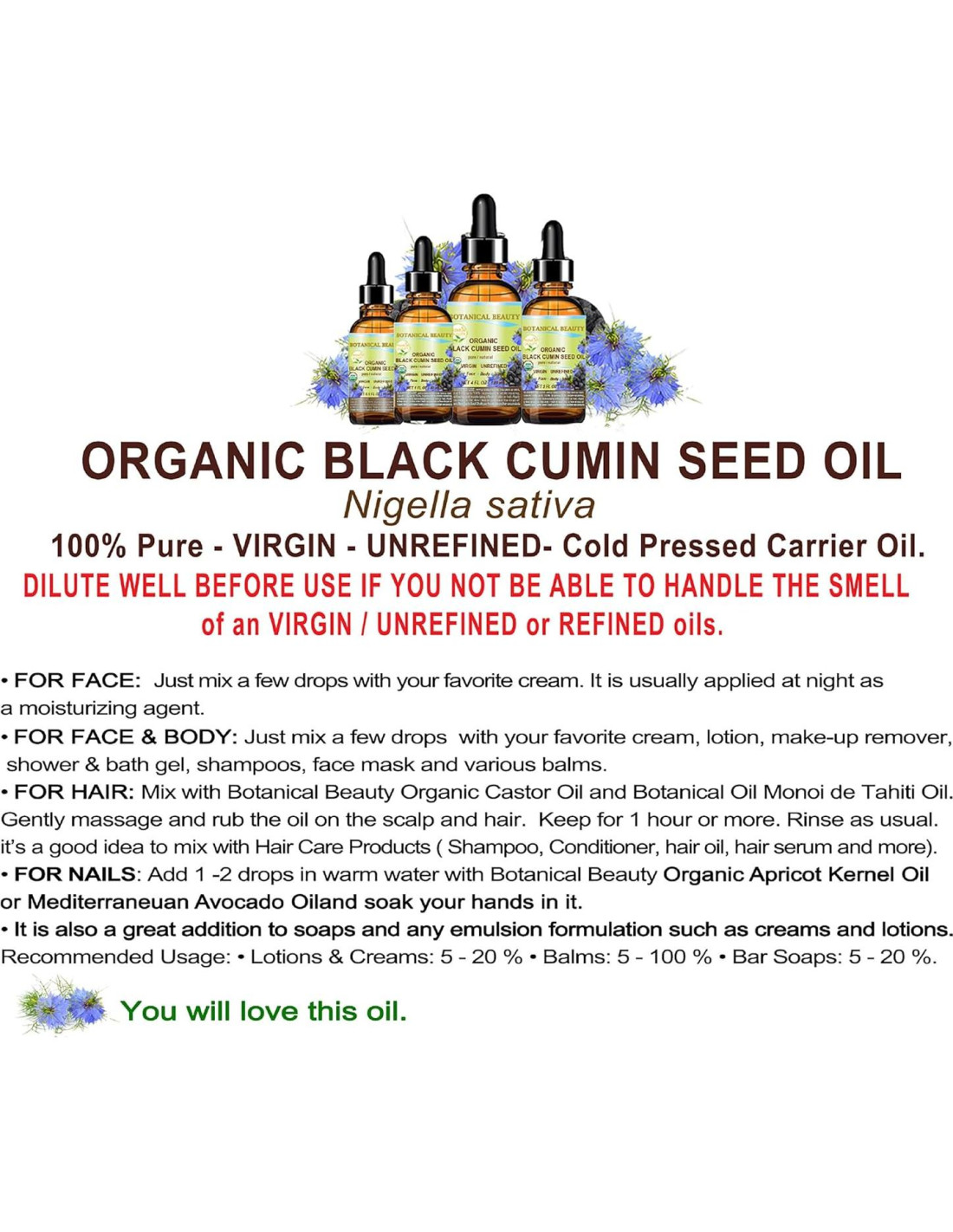 - El ACEITE DE SEMILLA DE COMINO NEGRO Orgánico Botanical Beauty es 100 % PURO, VIRGEN, NO REFINADO sin rellenos, aditivos ni fragancias artificiales añadidas, no obstruye los poros. Se absorbe rápidamente, dejando una sensación ligera y no grasa. No probado en animales, NO CONTIENE CONSERVANTES.
