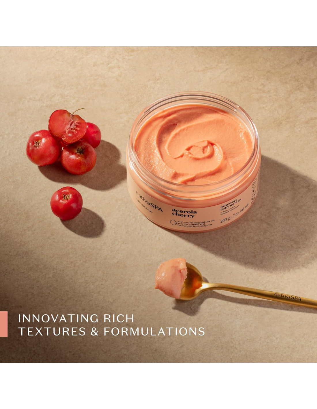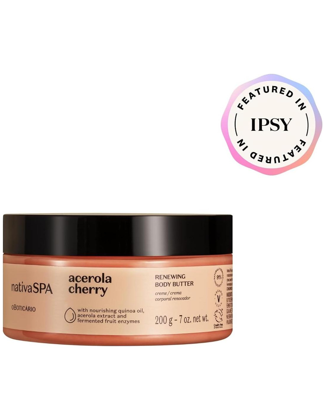 - Hidratación Intensa: Consiente tu piel con la rica textura aterciopelada de la Manteca Corporal Renovadora de Cereza Acerola Nativa SPA. Formulada con manteca de karité nutritiva, aceite de quinoa puro y extracto de acerola para una hidratación superior