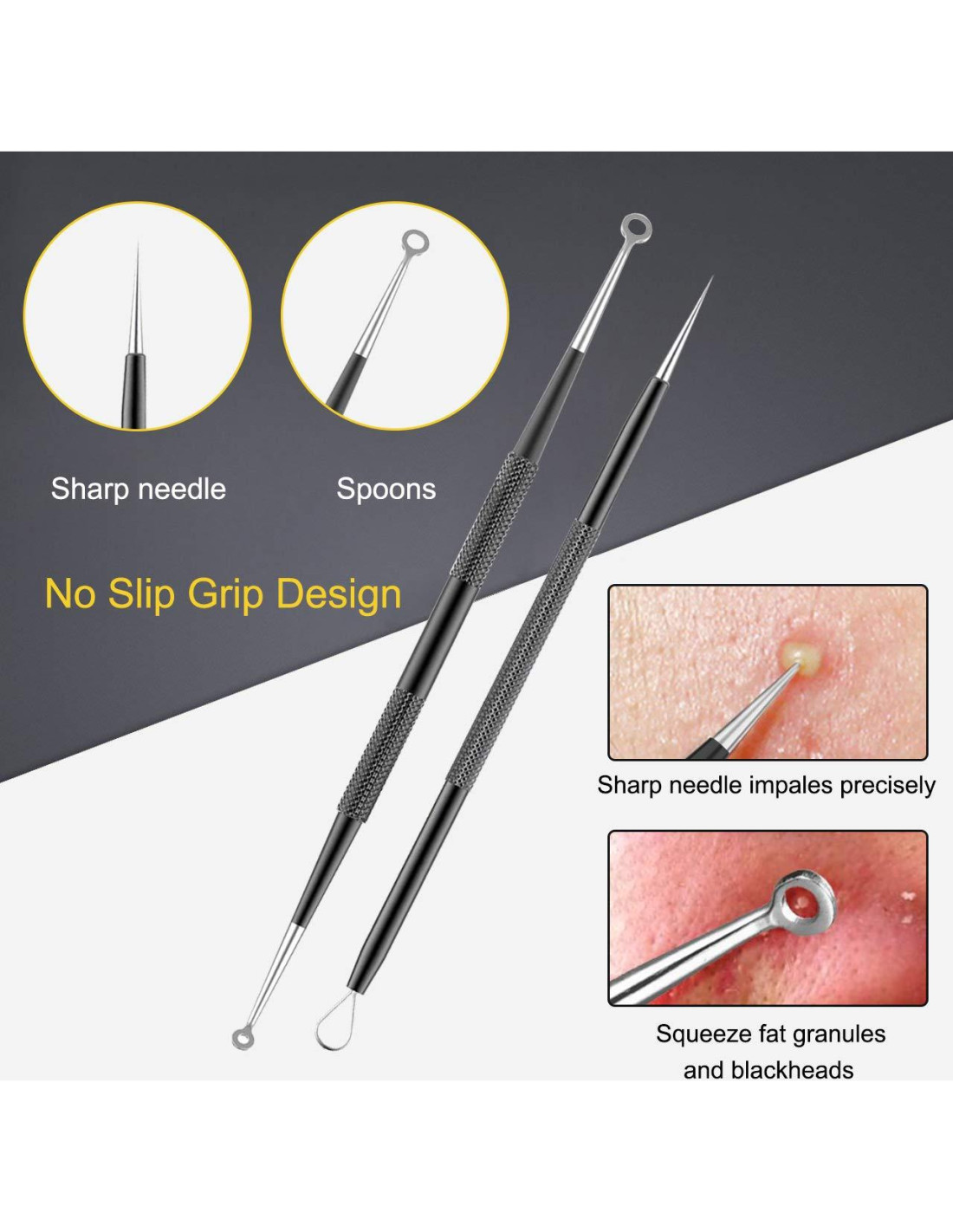 - Kit de Herramientas para Espinillas: 10 herramientas de diferentes estilos para remover puntos negros que pueden ayudar a eliminar puntos negros, espinillas, acné, diversas imperfecciones y extracción de granos en tu mentón, mejilla, frente y nariz fácilmente. No necesitas gastar miles con profesionales cuando puedes obtener el mismo efecto y aumentar tu confianza con nuestro extractor de espinillas.