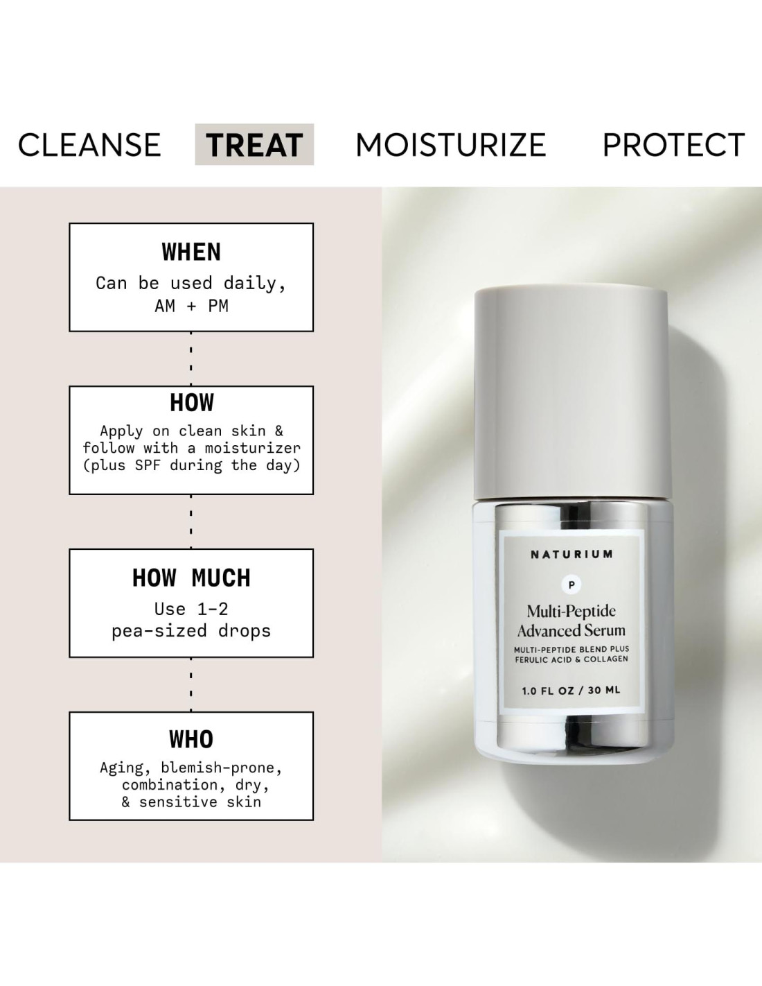 Nuestro poderoso suero facial está formulado con una mezcla avanzada de multi-péptidos, incluyendo péptidos de cobre encapsulados y péptido Argireline Amplificado, para mejorar la textura y reducir la apariencia de líneas finas y arrugas. Además, el ácido ferúlico encapsulado y el colágeno ayudan a reafirmar la apariencia de la piel para apoyar un cutis de aspecto más juvenil. Lo que hace Ayuda a mejorar la textura para un cutis más suave Apoya una piel de apariencia más firme Hidrata y da volumen para un efecto levantado NIVEL DE PH: Nivel de pH de la fórmula: 4.79 - 5.85 Nuestra misión es crear cuidado de la piel clínicamente efectivo y asequible, formulado con ingredientes naturales potentes y avanzados ingredientes sintéticos. Los productos de Naturium utilizan niveles eficaces de ingredientes activos, son apropiados para el nivel de pH y se prueban exhaustivamente para garantizar su seguridad. Se recomienda realizar una prueba de parche para todos los productos antes de su uso.