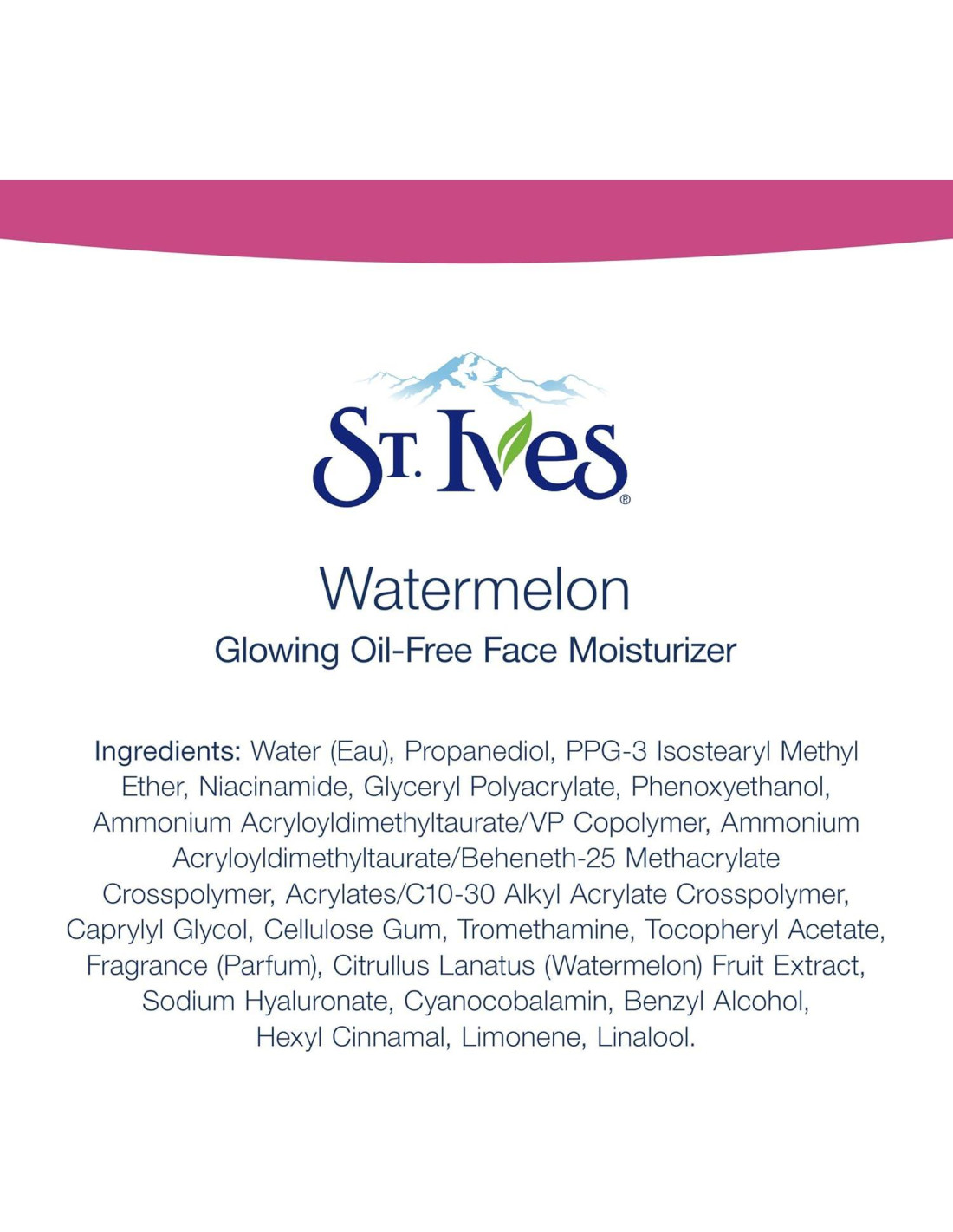 El Hidratante Facial Sin Aceite de St. Ives es el hidratante ligero perfecto para ayudar a restaurar tu brillo natural y darle a tu piel humedad siempre que lo necesites. Su fórmula para piel seca sin aceite tiene una fragancia refrescante de sandía para un toque de frescura jugosa cada vez que lo uses. El clima frío, el sueño, el sol y los productos de belleza pueden afectar la hidratación de tu piel. Ahora, puedes reponer cada vez que lo necesites con esta loción facial de rápida absorción. Nuestra fórmula no grasa está hecha con jugo de sandía 100% natural para un tratamiento seguro y efectivo de la piel seca. Diseñada para dejar la piel suave e hidratada, este tamaño es una gran adición a tu botiquín o bolsa de artículos de tocador, y añade un toque de color a cualquier tocador o mesa de noche. Además de sus beneficios para suavizar e hidratar la piel, esta crema facial ofrece beneficios de aromaterapia cada vez que la usas. Con fragancia de sandía jugosa, es una forma fácil de infundir un estallido de fragancia que mejora el estado de ánimo en tu día. St. Ives siempre ha encontrado inspiración para sus productos en la naturaleza y esta loción facial fresca no es la excepción. Como reflejo de su compromiso con la naturaleza, es libre de parabenos, libre de crueldad y hecha con jugo de sandía 100% natural, por lo que le da a la piel facial seca un tratamiento con fragancia de sandía cada vez que la aplicas. Puedes aplicarla debajo del maquillaje, como hidratante facial con SPF, suero, crema de colágeno o cualquier otra loción facial que forme parte de tu rutina diaria.