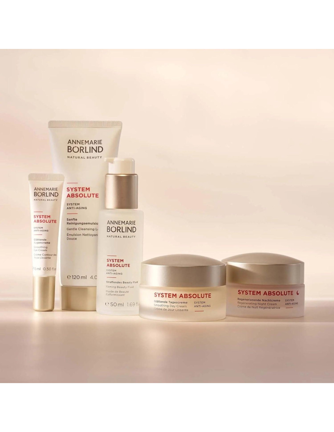 ANNEMARIE BRLIND representa productos de cuidado y cosméticos hechos exclusivamente de ingredientes naturales, sin extractos animales, derivados del petróleo o siliconas. Todos los ingredientes también son cultivados orgánicamente. Nuestros productos son conocidos por una cosa: están hechos solo de ingredientes activos naturales y están completamente libres de aditivos artificiales. ¡Eso es cuidado con una buena sensación! La gama de cuidado del sistema SYSTEM ABSOLUTE ayuda a reducir la profundidad de las arrugas. El extracto de algas verdes, incrustado en una matriz de ingredientes activos 3D del árbol tara, activa la producción de colágeno y elastina durante un período de tiempo más prolongado. Paso de Cuidado 1 Aplique sobre la piel seca en movimientos circulares y enjuague con agua tibia. Paso de Cuidado 2 Aplique sobre la piel limpia y dé golpecitos suavemente con los dedos. Paso de Cuidado 3 Aplique sobre la piel limpia y tonificada por la mañana y masajee suavemente. Paso de Cuidado 4 Aplique sobre la piel limpia y tonificada por la noche y masajee suavemente. Paso de Cuidado 5 Aplique por la mañana y por la noche y masajee suavemente. Crema Nocturna Loción Limpiadora Elixir de Belleza Crema de Día Crema para los Ojos ¿Son los cosméticos ANNEMARIE BRLIND cosméticos naturales? Nuestros productos cosméticos están certificados como cosméticos naturales por CSE (Economía Sostenible Certificada). No solo nuestros productos, sino toda nuestra empresa y nuestro enfoque son auditados regularmente. ¿Los cosméticos naturales funcionan de manera diferente a los cosméticos convencionales? Sí, los cosméticos naturales ayudan a la piel a activar sus propios mecanismos y regenerarse para recuperar su equilibrio natural. Con materias primas naturales, los cosméticos naturales le dan a la piel lo que realmente necesita. ¿Dónde se fabrican los productos ANNEMARIE BRLIND? Nuestros productos se desarrollan y fabrican en Calw en la Selva Negra. Aquí es donde tiene sus orígenes nuestra empresa y donde siempre ha estado ubicada nuestra producción. La fabricación en la Selva Negra es parte de nuestra promesa de calidad. ¿Son todos los productos ANNEMARIE BRLIND veganos? Todos nuestros productos son vegetarianos, es decir, sin extractos de animales muertos. Nuestros productos no veganos contienen, por ejemplo, cera de abejas como ingrediente no vegano.