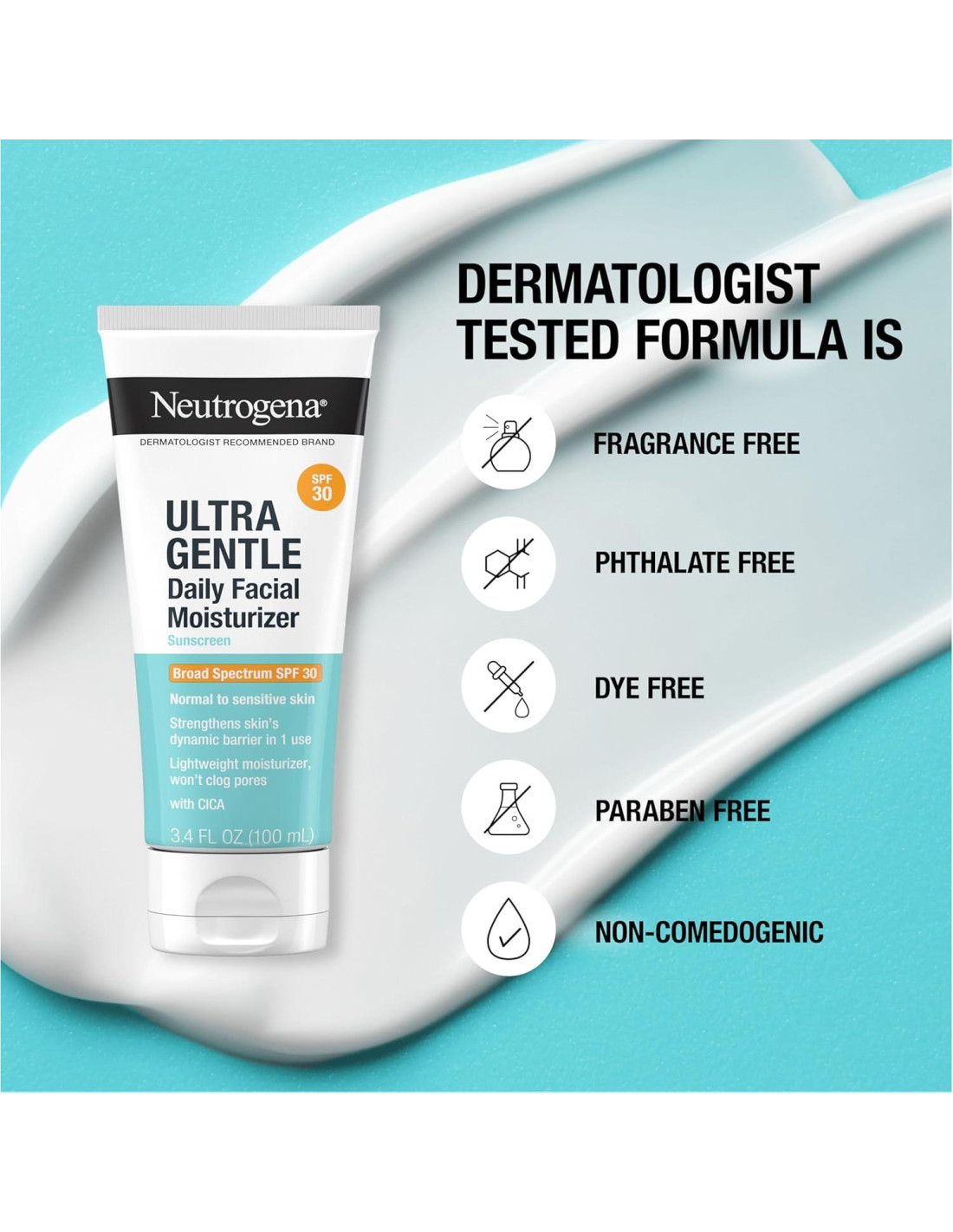 - 100 ml de Neutrogena Ultra Gentle Daily Facial Moisturizer with SPF 30 Sunscreen ayuda a proteger la piel normal a sensible del sol y a fortalecer la barrera dinámica de la piel en solo un uso