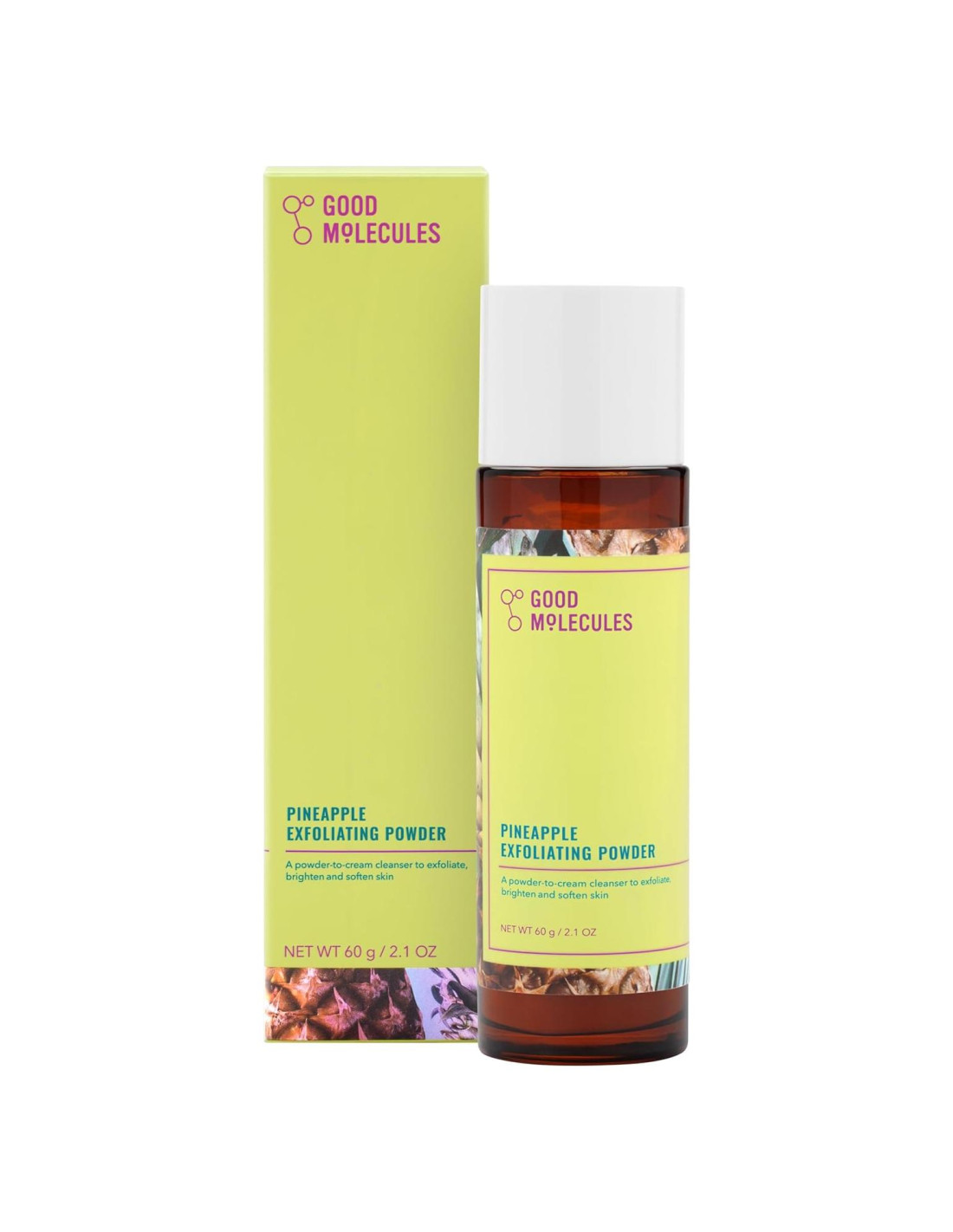 Polvo Exfoliante de Piña de Good Molecules 60g/60g Polvo Fomenta una exfoliación suave con este polvo limpiador formulado con enzimas de frutas, vitamina C y polvo de arroz para suavizar, iluminar y exfoliar suavemente. Los almidones de arroz naturales y el polvo de seda pulen suavemente la piel para eliminar las células muertas de la piel sin ser demasiado abrasivos. Estos polvos granulares se disuelven al mezclarse con agua formando una espuma cremosa. Esto resulta en una exfoliación física mucho más suave que los granos o microperlas y te permite tener más control sobre la textura y la aspereza del exfoliante. ¡No solo frotamos la piel! Los extractos de piña, kiwi y papaya contienen bromelina que ayuda a crear una reacción enzimática que ayuda en la eliminación de proteínas de queratina acumuladas y células muertas de la piel de la superficie de la piel, revelando una piel sedosa y más juvenil. Nuestra fórmula también contiene vitamina C para una renovación y nutrición extra, así como calamina para calmar, tranquilizar y proteger la piel. Ve una Diferencia en Tu Piel En Good Molecules, queremos que te sientas y te veas lo mejor posible. Nuestro polvo exfoliante fue creado para darte un tono de piel más brillante y equilibrado, mientras que al mismo tiempo calma, suaviza y aporta una profunda nutrición. Si bien los resultados son inmediatos (y, por supuesto, se puede agregar fácilmente a las noches de faciales ocasionales), este producto se puede usar 3-4 veces a la semana y es una maravillosa adición a tu rutina de cuidado de la piel regular. Nuestro Polvo Exfoliante de Piña es lo suficientemente suave para todo tipo de piel y no contiene productos químicos agresivos ni irritantes comunes. Todos nuestros productos son libres de crueldad y veganos.