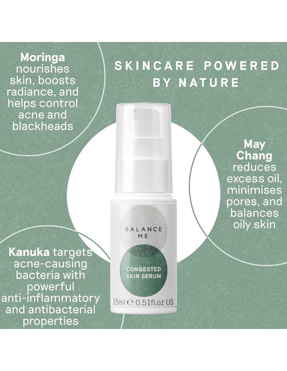Deja la piel completamente limpia y fresca. Elimina el maquillaje suavemente y aumenta la hidratación. Combate los puntos negros de manera efectiva. Apunta a las áreas propensas al acné. Refina la apariencia de los poros. Crema de día nutritiva que calma, alivia y fortalece la piel sensible. ¿Para quién es? Ideal para piel mixta, grasa y propensa a imperfecciones y lo suficientemente suave para piel sensible. Este tratamiento localizado no secante ayuda a mantener la piel libre de imperfecciones. ¿Cuánto debo usar? Aplica una pequeña cantidad sobre las imperfecciones o en cualquier área propensa a brotes. Usa por la mañana o por la noche después de limpiar. El tratamiento se puede reaplicar a lo largo del día y también se puede usar sobre el maquillaje. Ingredientes activos: Kanuka, May Chang, Eucalipto, Moringa. ¿Para qué tipos de piel es adecuado el Suero para Piel Congestionada? Este suero es adecuado para todos los tipos de piel. Es particularmente beneficioso para aquellos con piel mixta, grasa o propensa a imperfecciones.